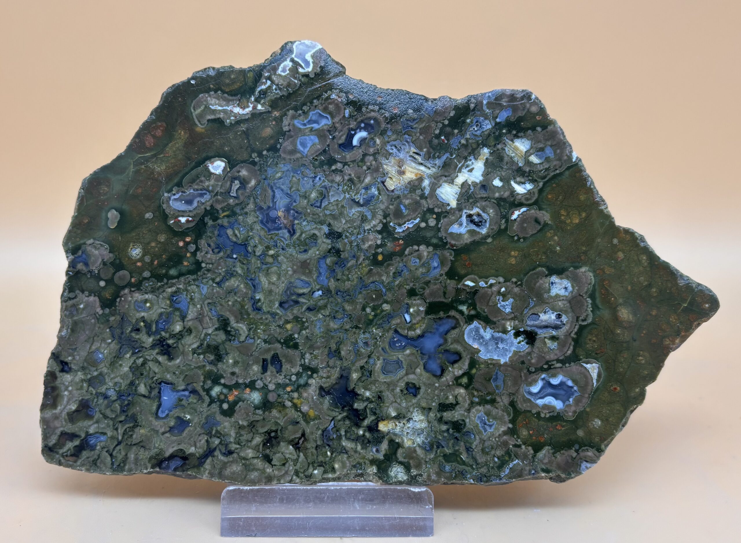 mit Rhyolith-Knollen verwachsenes Gesteinsfragmentaus Australischem magmatischem Gestein des ehemaligen Vulkan Mt. Hay in Queensland. Rohstück-Anschnitt mit polierter Oberfläche und rückseitiger Naturkruste.