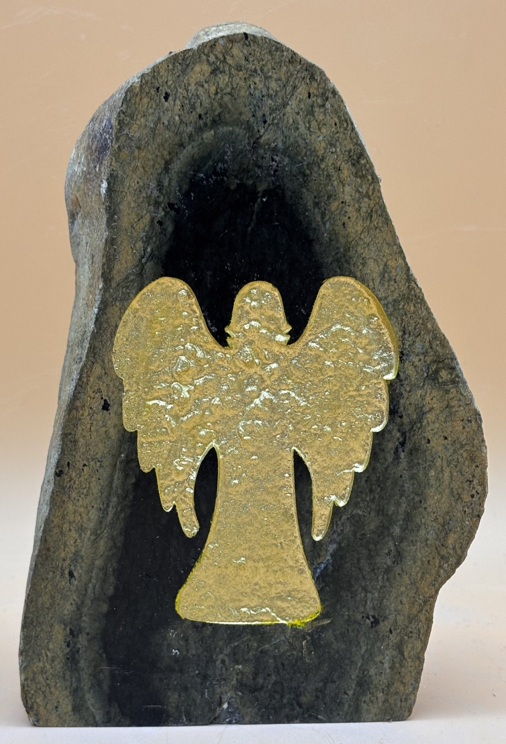 Engel-Shilouette im Walliser Rhone Serpentin. Durch die lange Zeit im Wasser, konnte das Eisenoxyd des Serpentin sich zu Limonit umwandeln und es entstand einer Höhle ähnlich diese Struktur. Engel handwerklich eingearbeitet und M-vergoldet, Oberfläche poliert, Rückseite Natur. Schweizer Handarbeit
