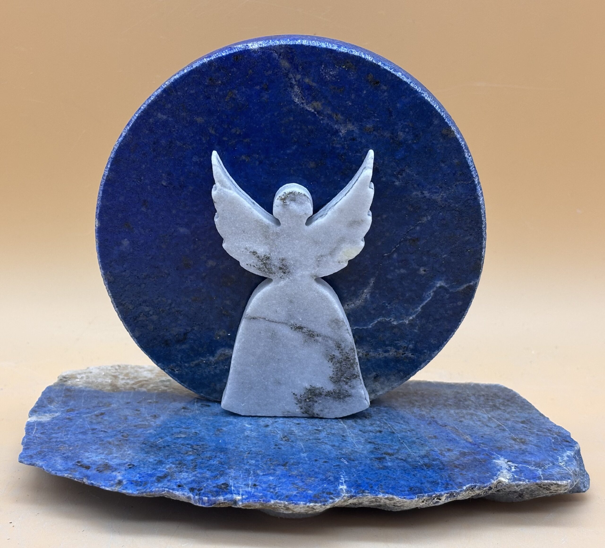 Walliser Goldmarmor-Engel auf türkisblauer Lapislazuli-Scheibe, Oberfläche poliert und geschliffen, Basis mit Naturkante, Handarbeit aus Bayern