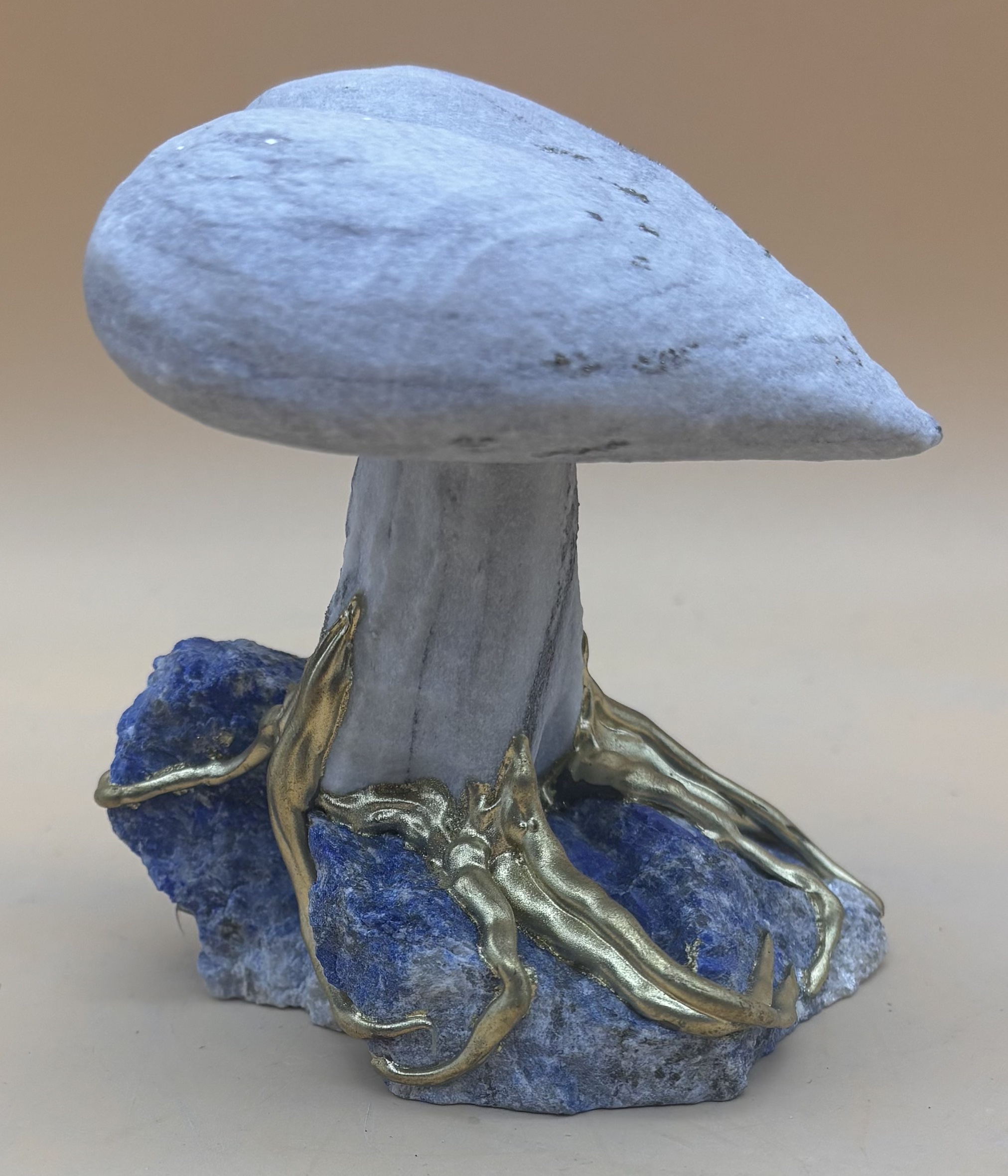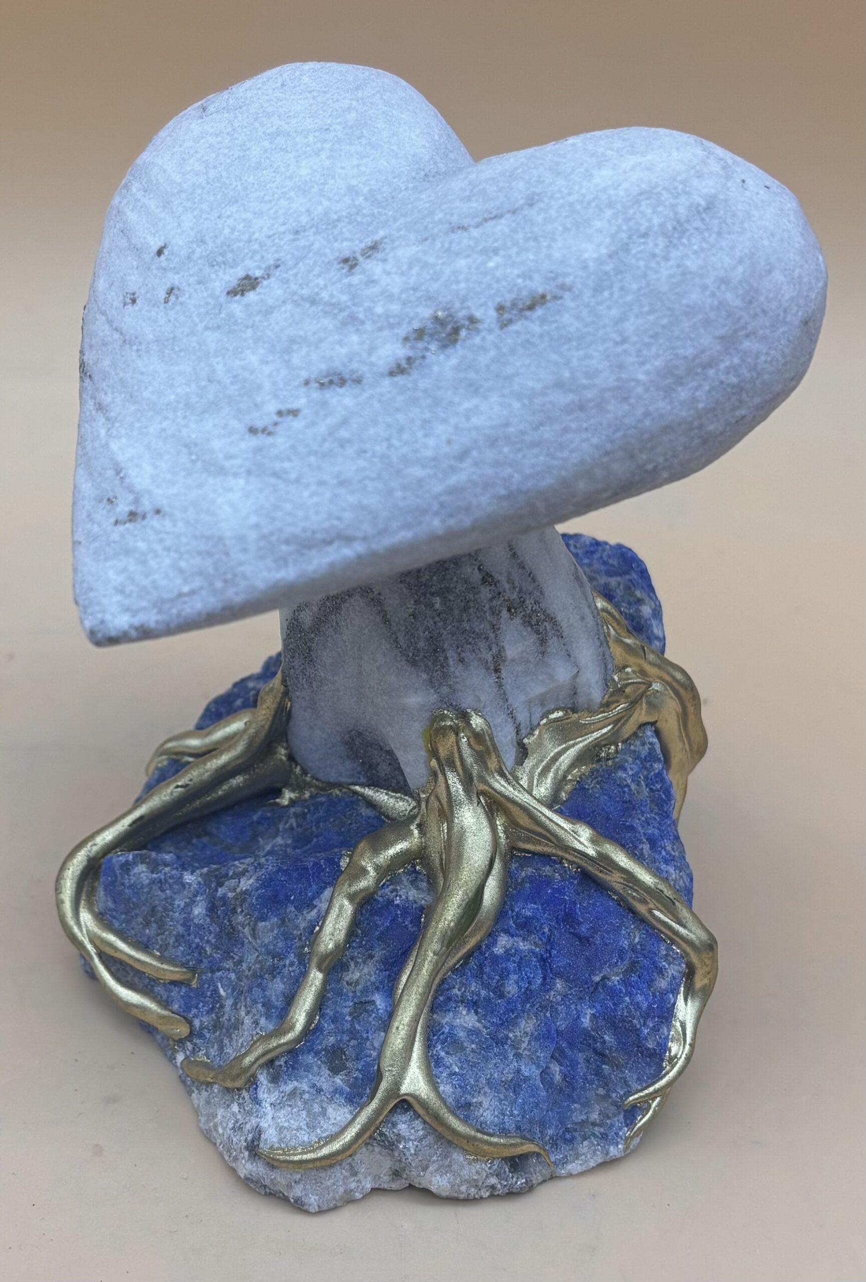 die Liebe wurzelt am Blau des Lebens. Goldene Wurzeln halten fest was sich lohnt fest zu halten. Schweizer Handarbeit aus Walliser Goldmarmor, Afghanischem Lapislazuli und M-vergoldeten Wurzeln aus Steinharz