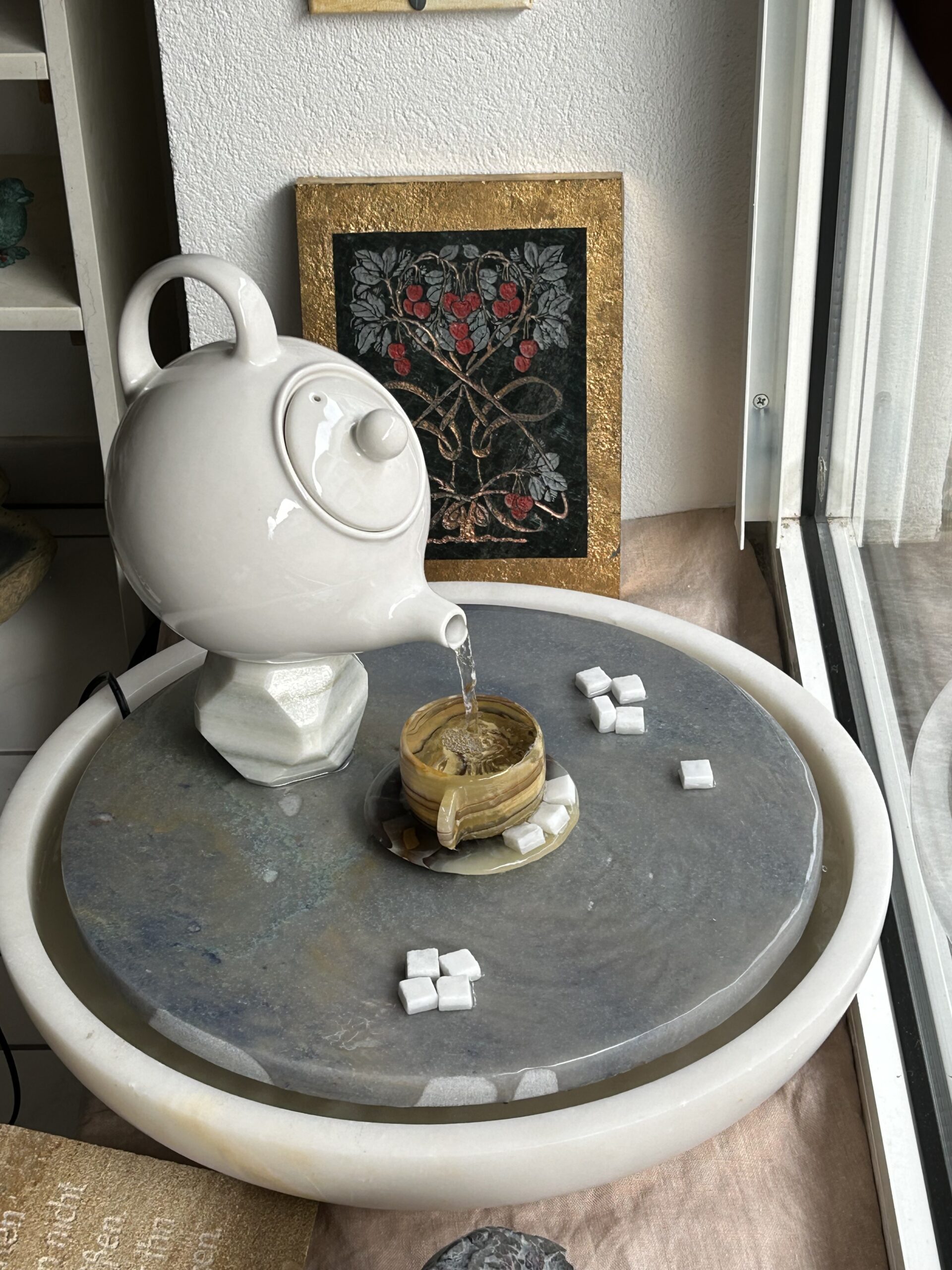 Keramik-Kanne auf Marmorwürfel, Kaffeetasse aus Onyx, Zuckerwürfel aus weißem Marmor, Basisplatte Azul Bochira Quarzit und das das Wasser hält, ein Becken aus massivem Marmor. Kleine Umwälzpumpe und Silikonschlauch ist auch dabei. Hergestellt wo das Wasser haust, in Bad Wörishofen.