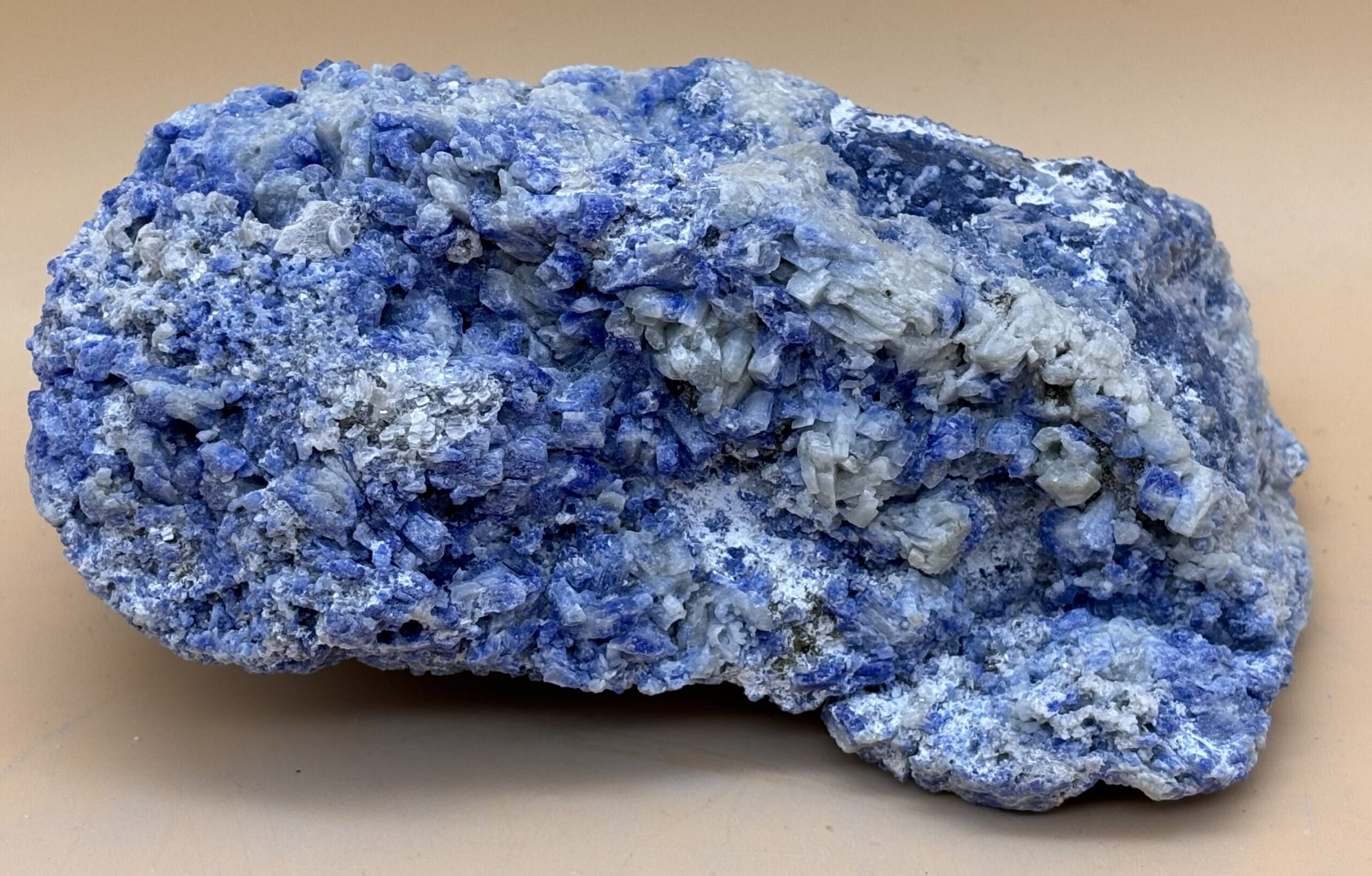 kristalliner Afghanischer Lapislazuli Rohstein mit blauer Matrix und feinen zum Teil blau-weißen Calcit-Kristallen. Sehr schönes und seltenes Sammlerstück