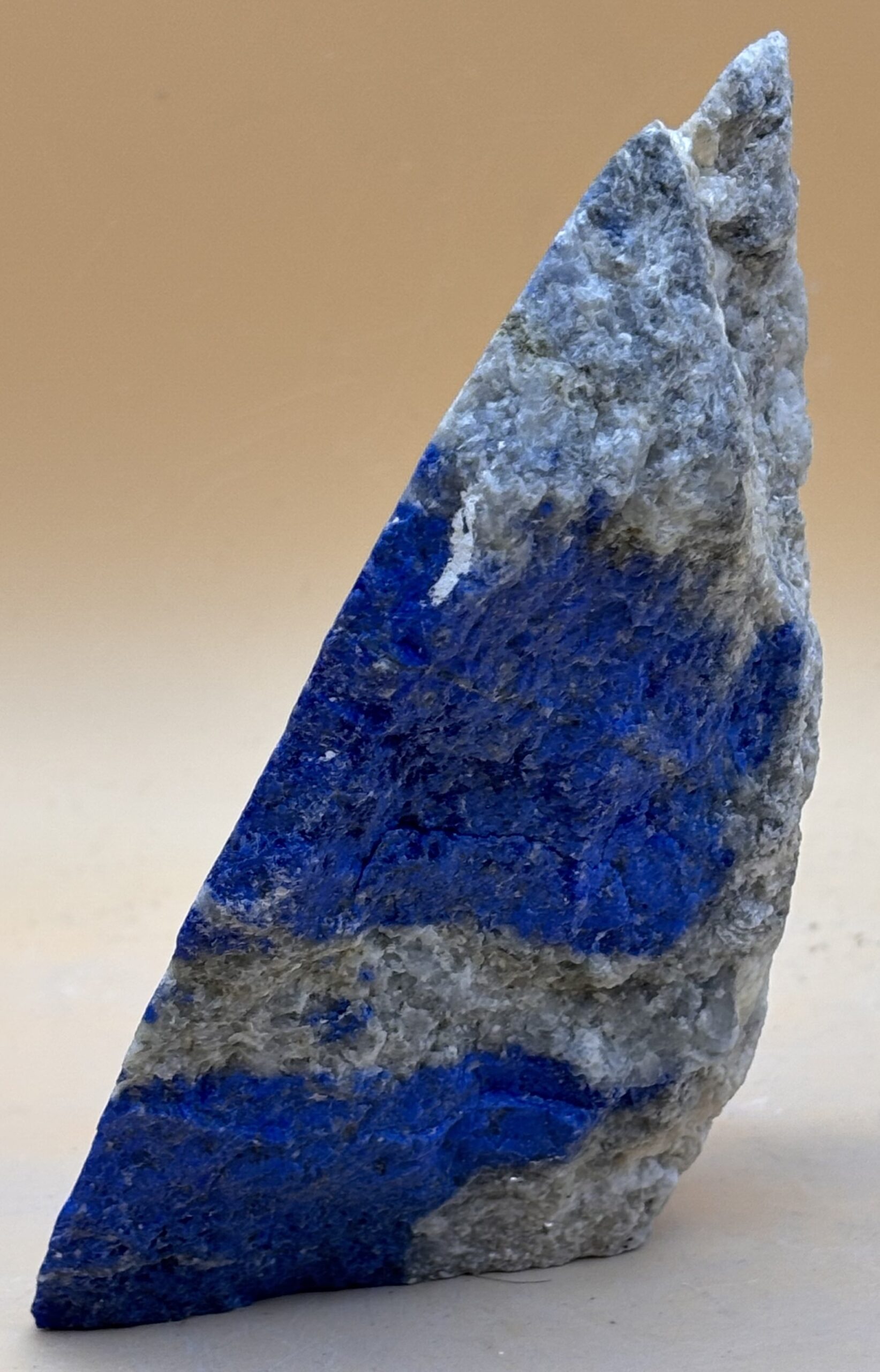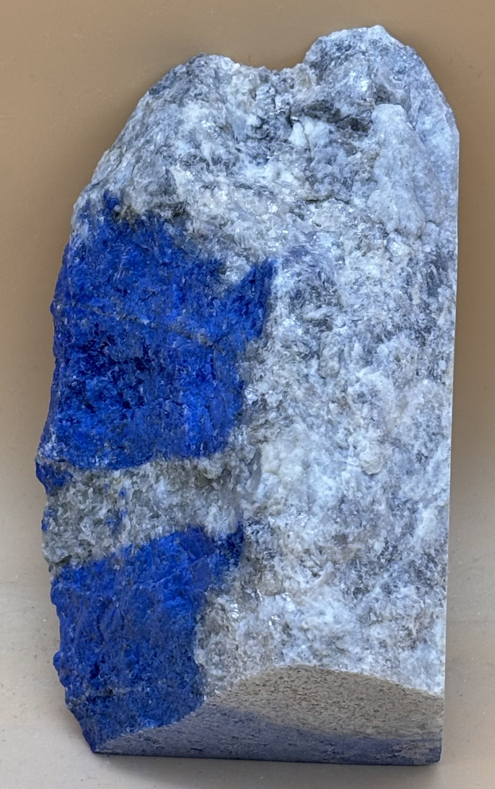 gesägtes Handstück aus Afghanischem Lapislazuli mit einer polierten Seite, Rückseite roh. Königsblaue Farbe, Hergestellt aus Rohware in Bad Wörishofen