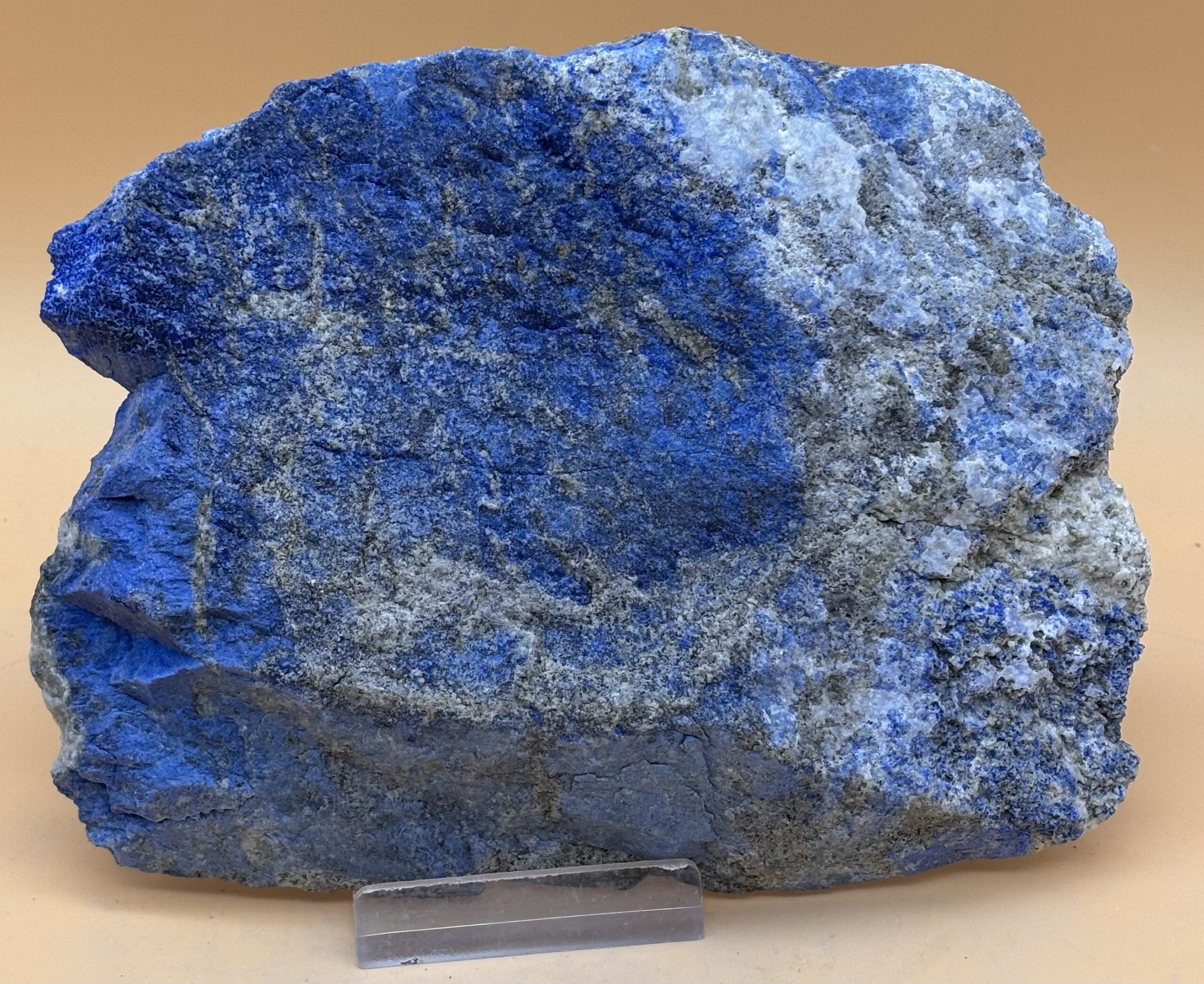 Blaue, mit feiner Eisenoxidation und hellen Calcit durchwachsene Gesteinformation, Oberfläche poliert, Rückseite Naturfels