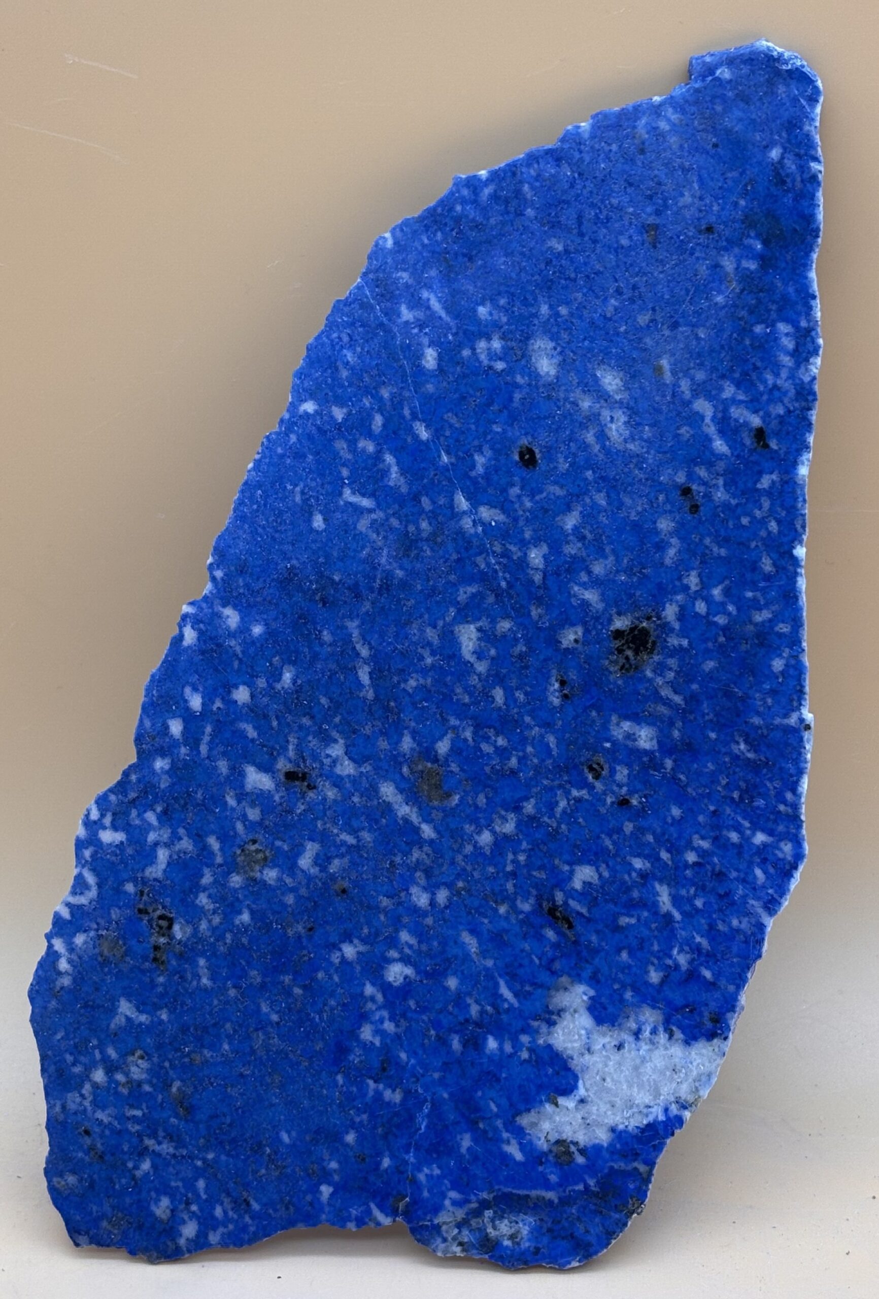 leicht konisch geschnittene Lapislazuli-Dünnschliff-Platte von 0,4 bis 0,02 cm, Platte ist stabil, Oberfläche poliert, blau durchscheinend
