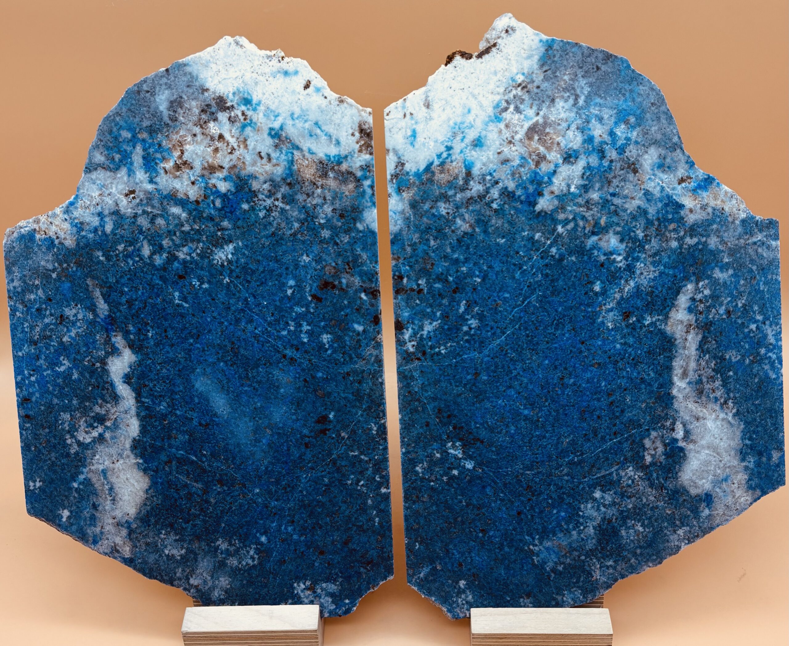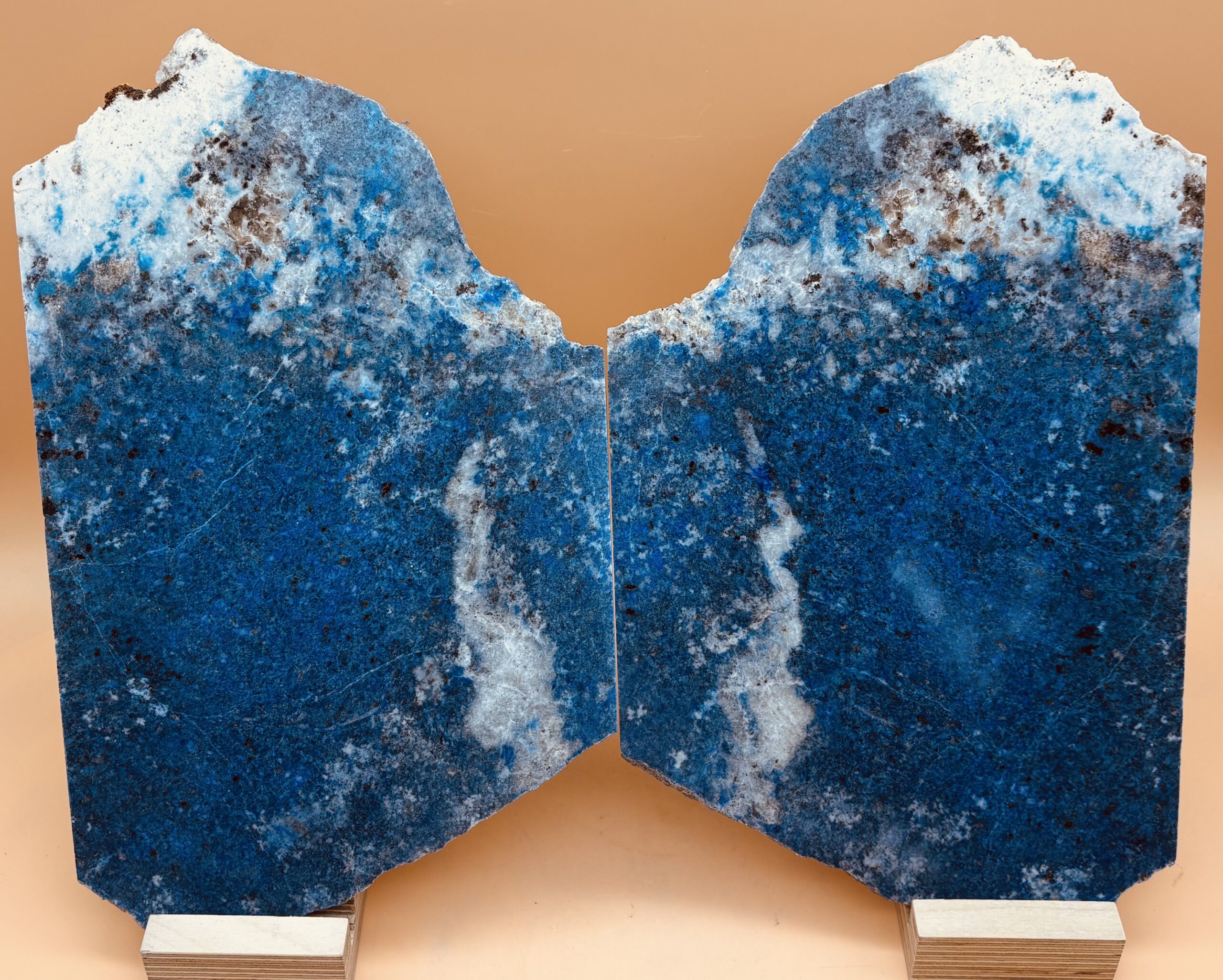 zwei Patrol-farbene Lapislazuli-Dünnschliff-Platten, Oberfläche poliert, im Spiegel geschnitten