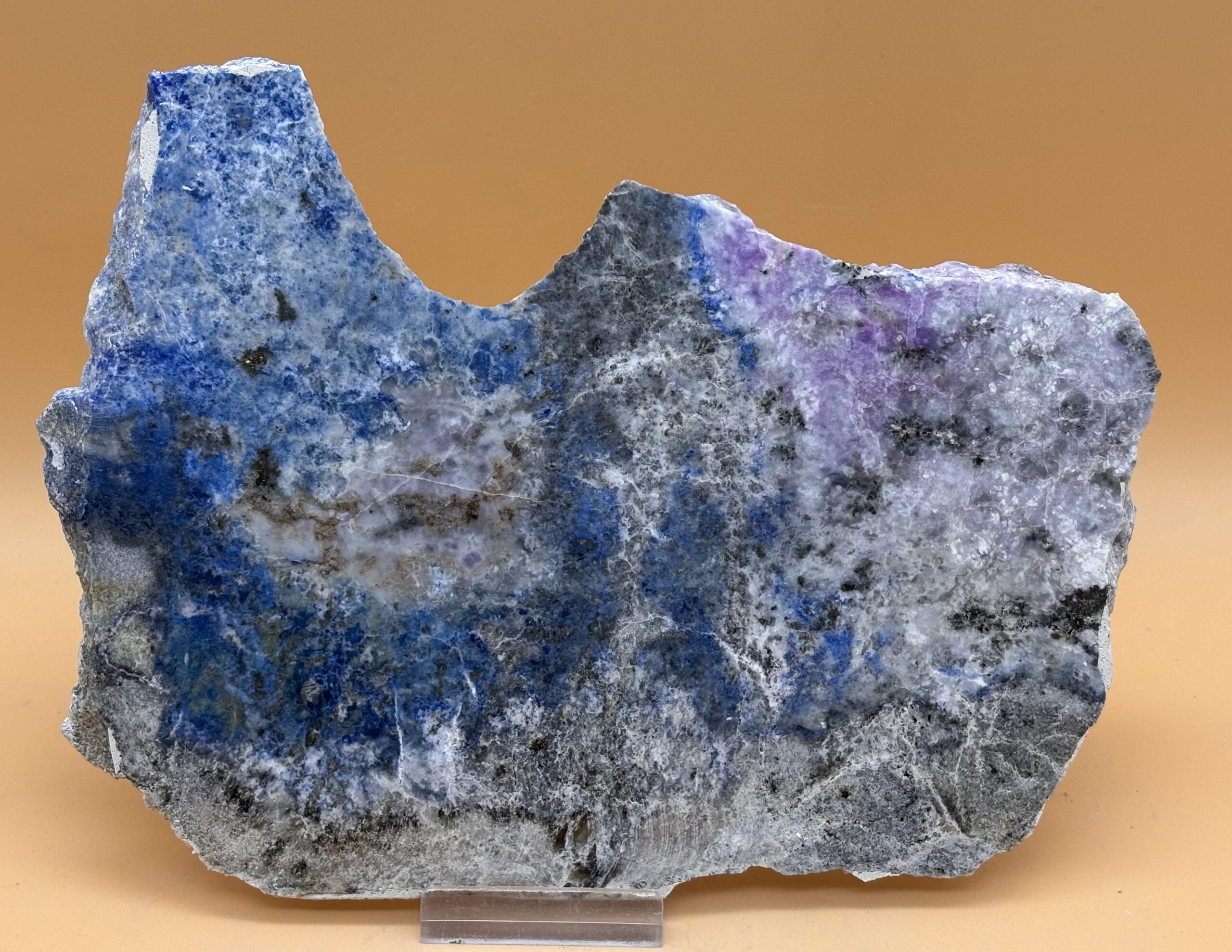 farbreiche metamorphe Lapislazuli- Gesteinskomponente mit seltenem Sugilith, Oberfläche poliert, der Beweis das Lapislazuli auch hydrothermal in weißen Rauchern entstehen konnte. Nebengemenge von Pyrit, Calcit und Magnesiumreiche Glimmer im Randbereich.