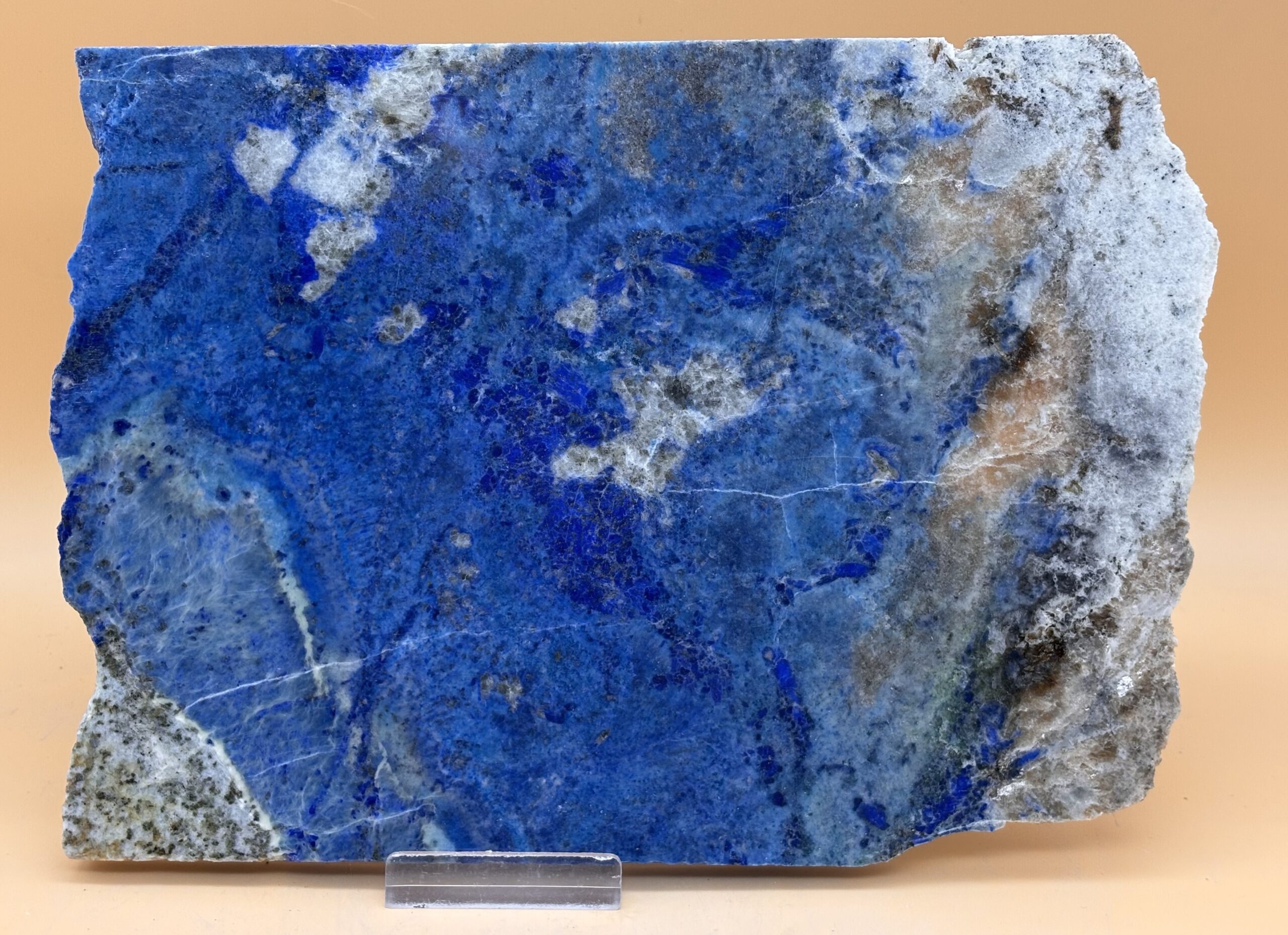 alle Farben in Blau, Lapislazuli in farbenprächtiger Struktur, teils durchseinend, Oberfläche poliert, Rückseite mit leichtem Absatz