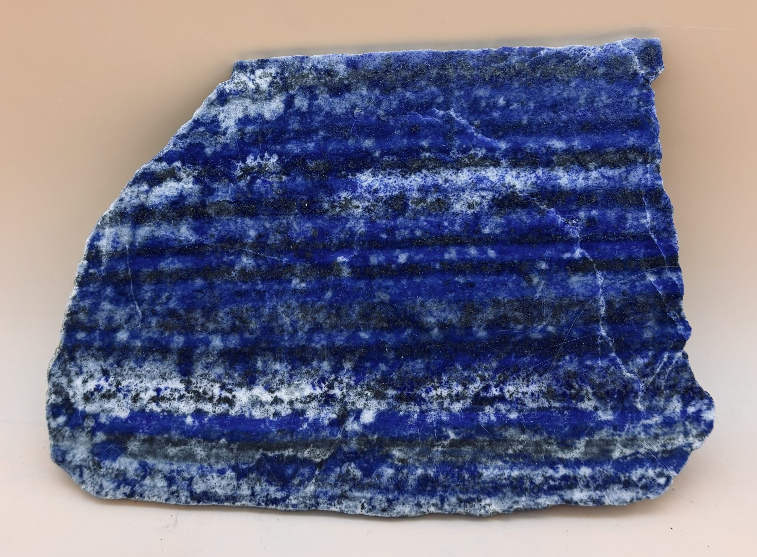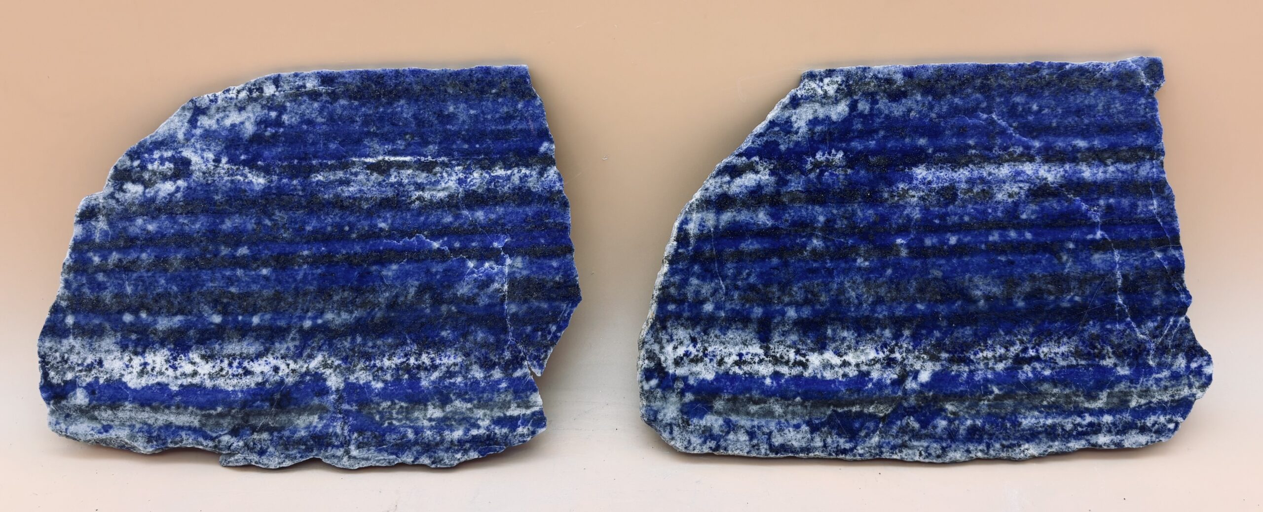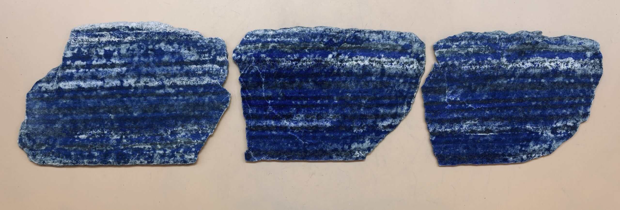 fein geschichtete Lagen mit Lapislazuli, Calcit und Pyrit dieser drei Platten sind im Handel nicht üblich. Wir schneiden sie jedoch gegen das Lager, so kann man im Gesteinsaufbau lesen, wie bei einer Baumscheibe.