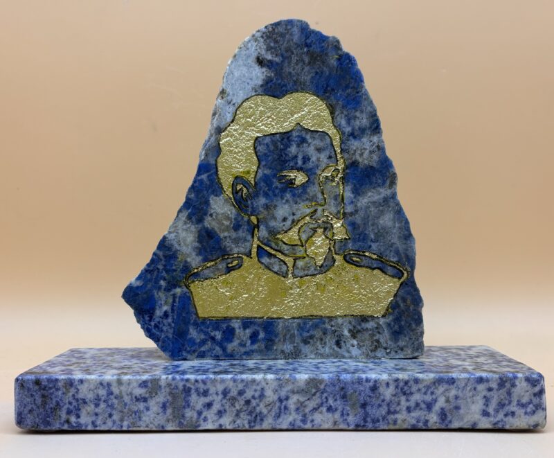 Libelle, Objekt aus Epidot, Serpentin und Lapislazuli. Idee und Herstellung durch Bildhauermeister Peter Fraefel, der auch die dazugehörenden grün-schwarzen Mineralien bei einer seiner Strahlertouren gefunden hat. Fundort des Epidot und Serpentin ist das Tal der Mineralien, das Walliser Binntal.