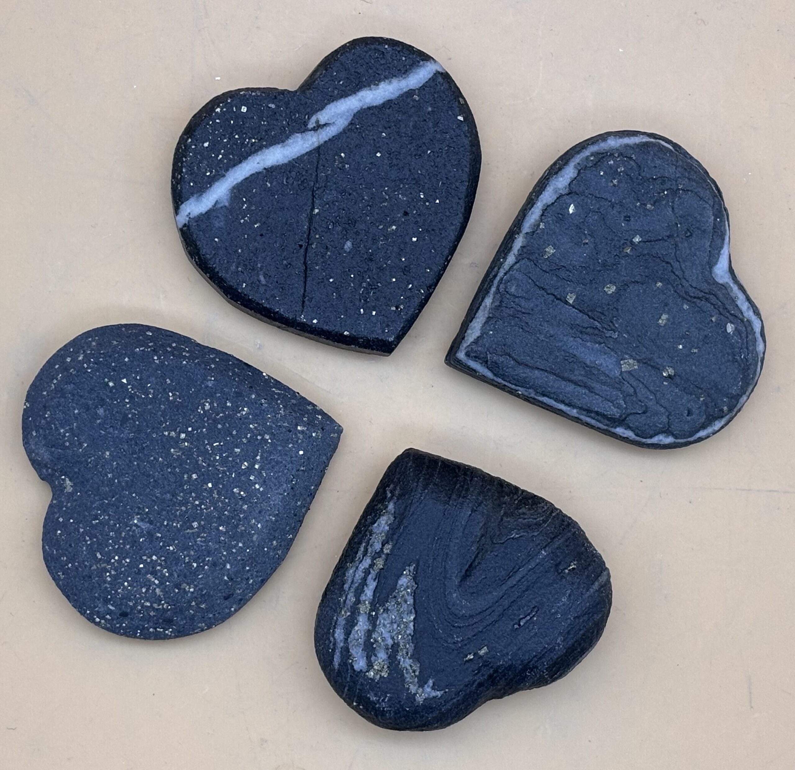 alle guten Dinge sind Vier. Vier reine Nolla Pyrit Schiefer Herzen aus Graubünden, kein Herz gleicht dem anderen. Oberfläche jetgestrahlt, Schweizer Handarbeit,