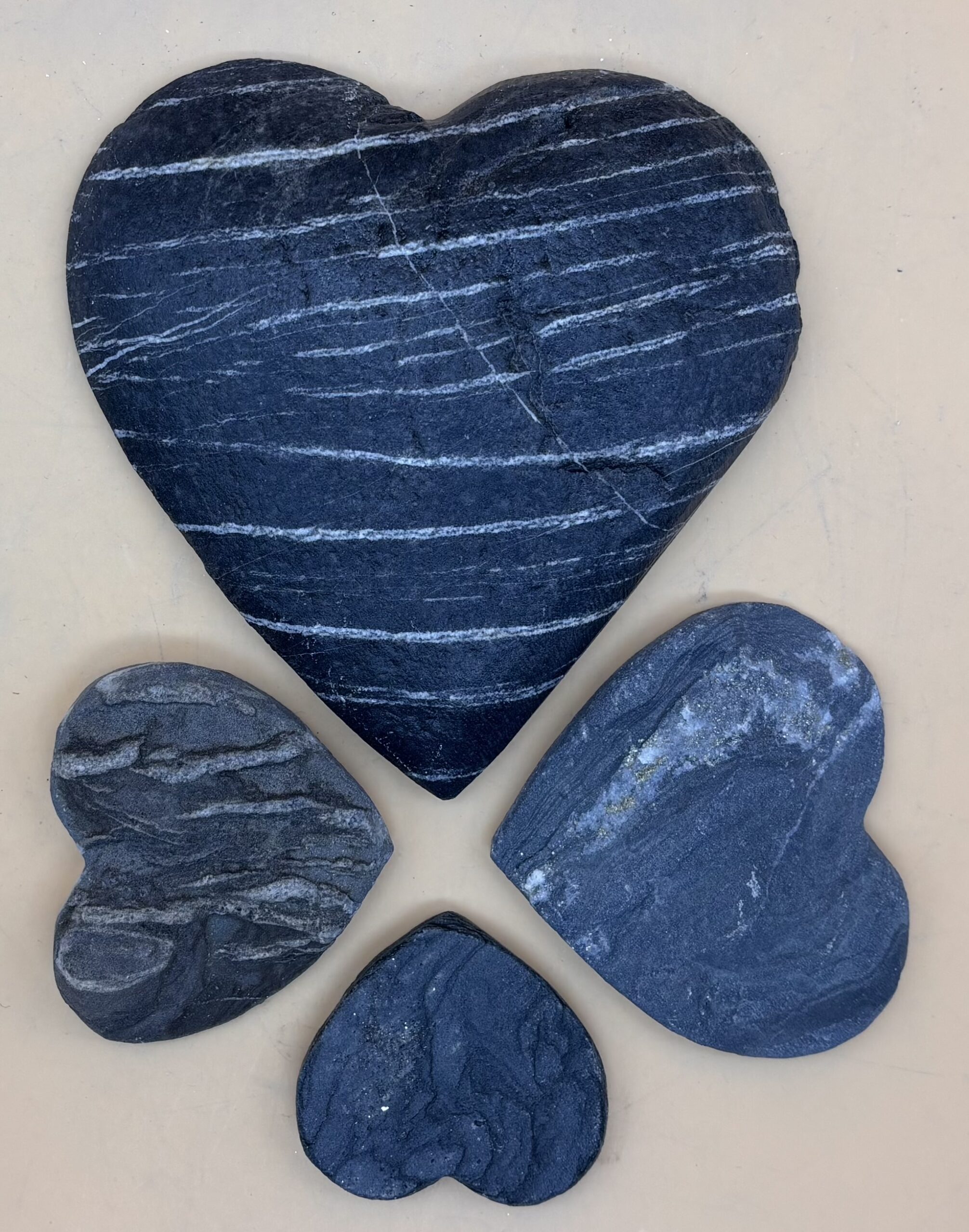 Drei kleine und ein großes Herz aus Graubündener Rheingold Schiefer, Schweizer Handarbeit