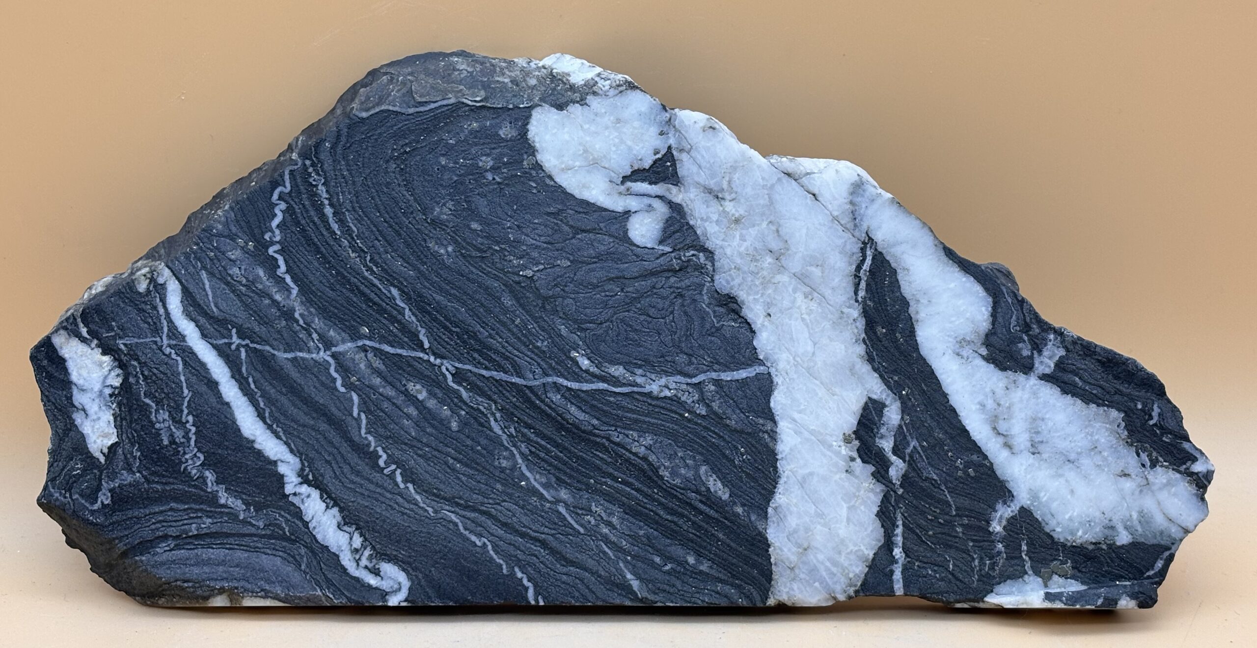 Graubündener Rheingoldschiefer vom Hinterrhein, strukturreiche Gesteinsplatte mit feinen Pyritkristallen und Quarzaderung, Oberfläche jetgestrahlt