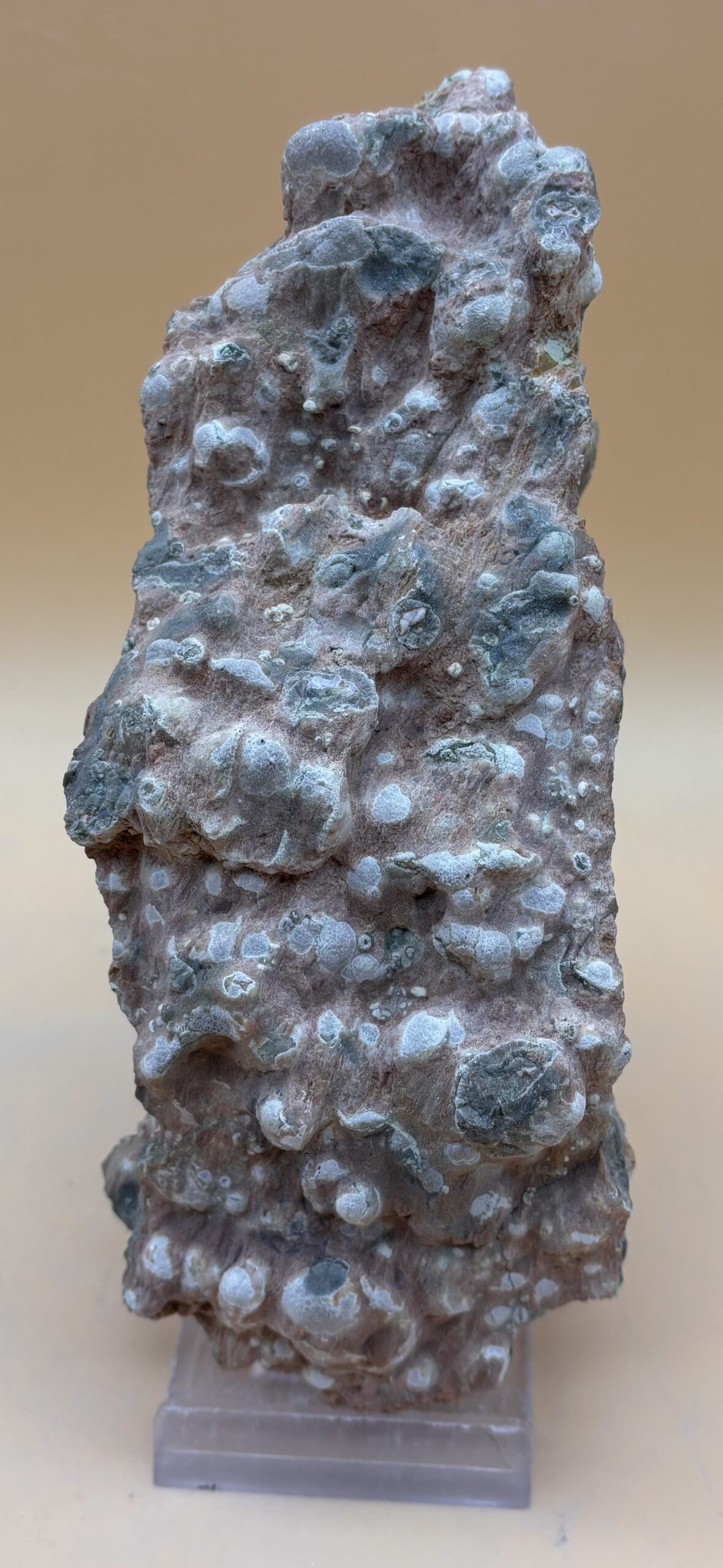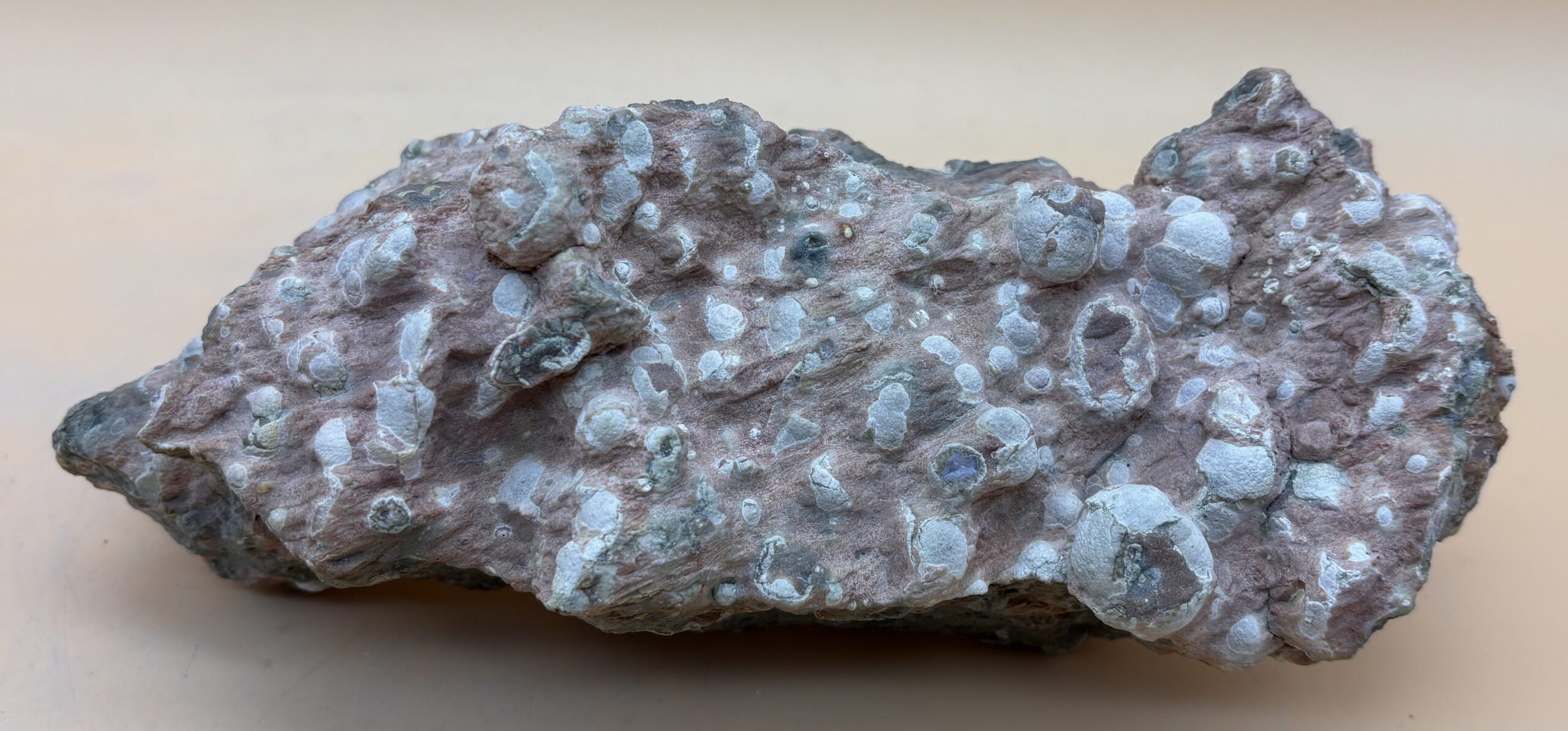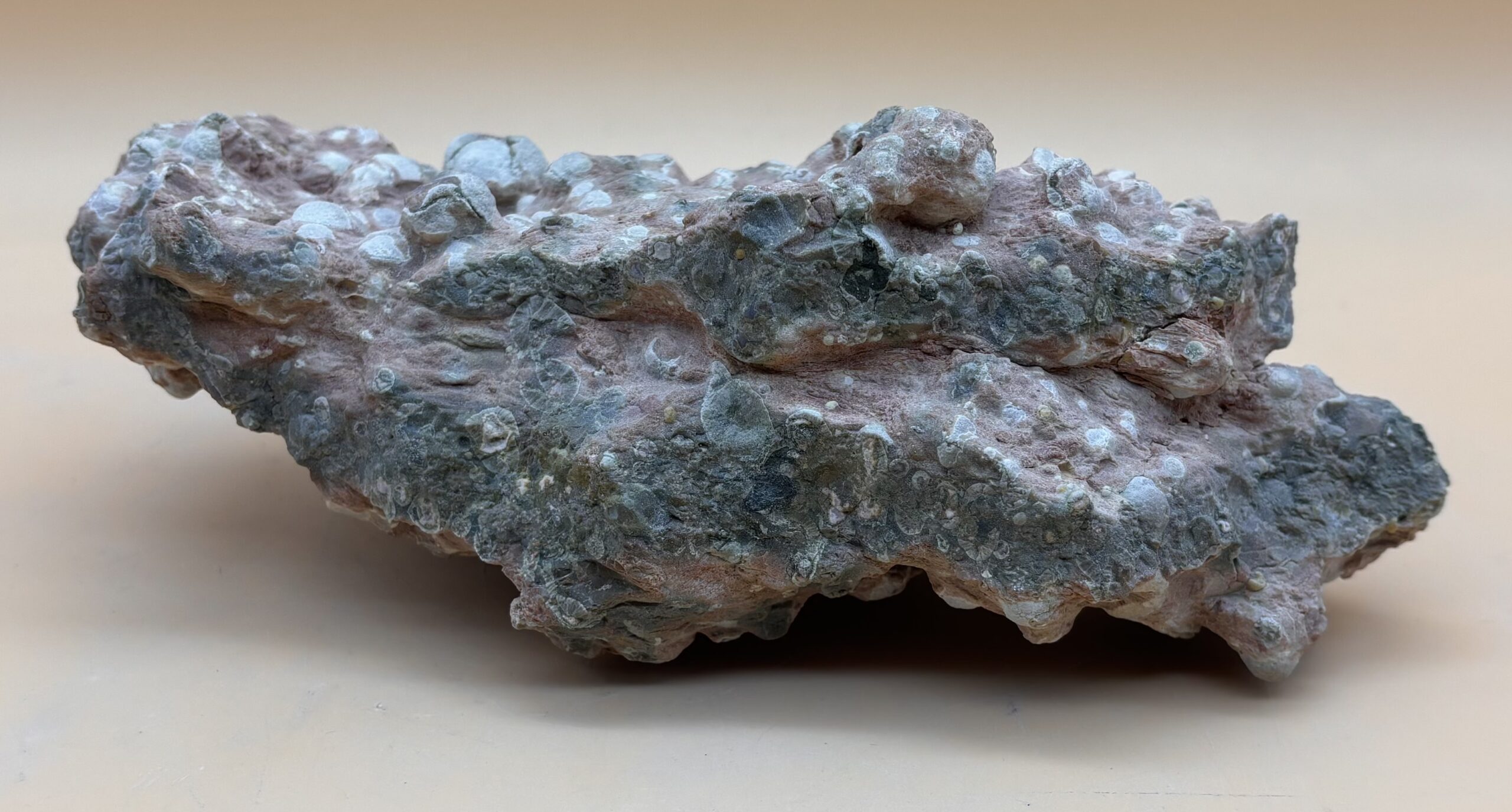Rhyolith Randzonen-Rohstück eines Lava-Ablaufkanal vom ehemaligen Vulkan Mt. Hay Queensland. Vom Vulkan ist nur noch eine hügelige Basis mit leicht rötlicher Erosionsablagerung erhalten geblieben. Vereinzelt entdeckt man noch Reste der unterirdischen Ablaufkanäle die im oberen Randbereich Nester von solchen Rhyolithen beherbergen können. Schön strukturierte Stücke sind selten, da die meisten Gesteine durch die Abtragung zermahlen wurden. Kieselsäure reiche Knollen liegen wegen ihres Gewichtes und ihrer Härte tiefer im Boden und müssen mit Mühe bei über 38 Grad im Schatten ausgegraben werden. Eigenfund