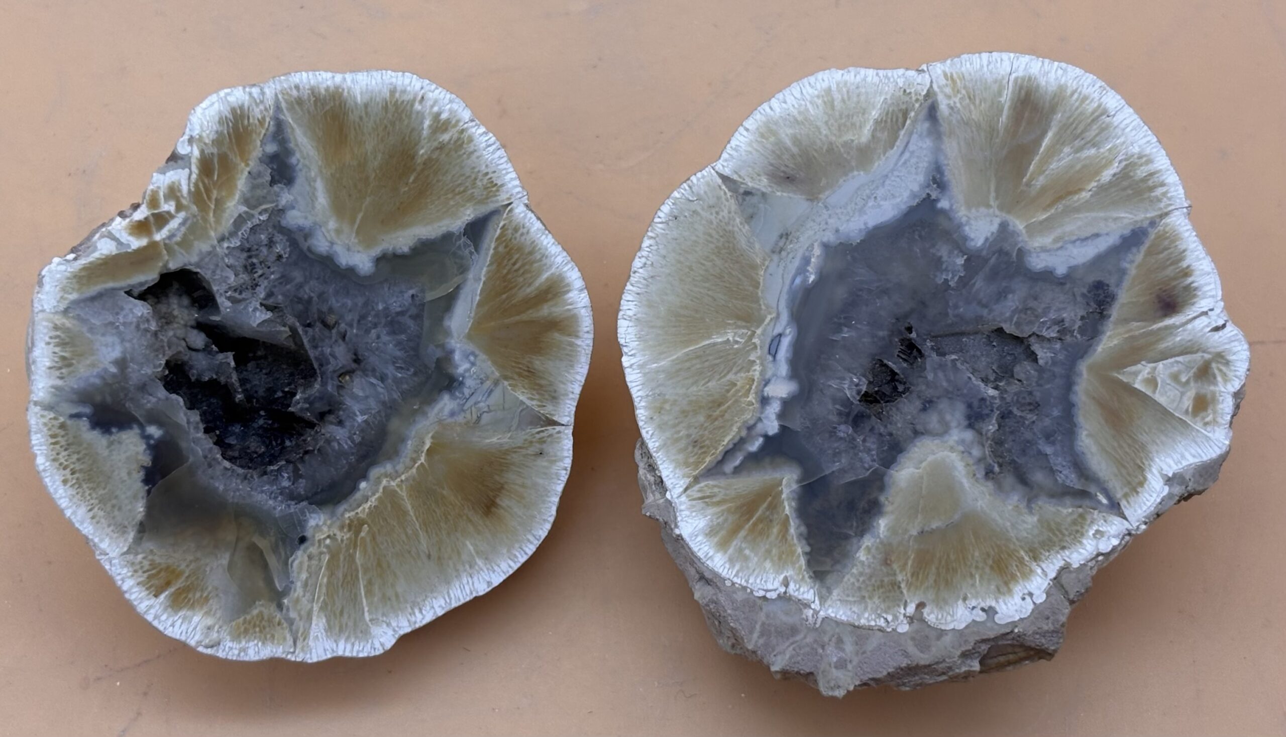 Australische Rhyolith-Knolle vom Mt. Hay Queensland, halbiert und poliert. Sehr schöne Sternförmige Zeichnung des Achat. Eigenfund