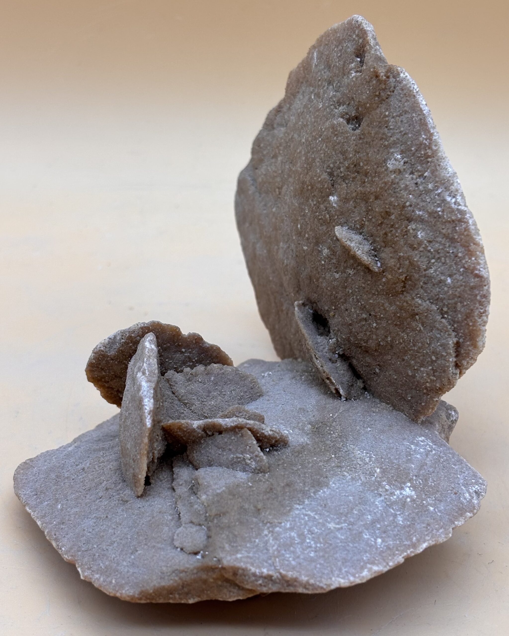 Sandrose, auch Selenit-Rose genannt. Entstehung : wenn Regen ( leicht sauer ) auf Wüstengebiete abregnen, beim Versickern im Untergrund feinsten Calcit / Kalk aus den Sandflächen löst und diesen auf einer Wasser undurchlässigen Schicht wieder ablagert, entsteht Gips, in kristalliner Form, so wie diese schöne Sandrose. Herkunft : Sahara Marokko.