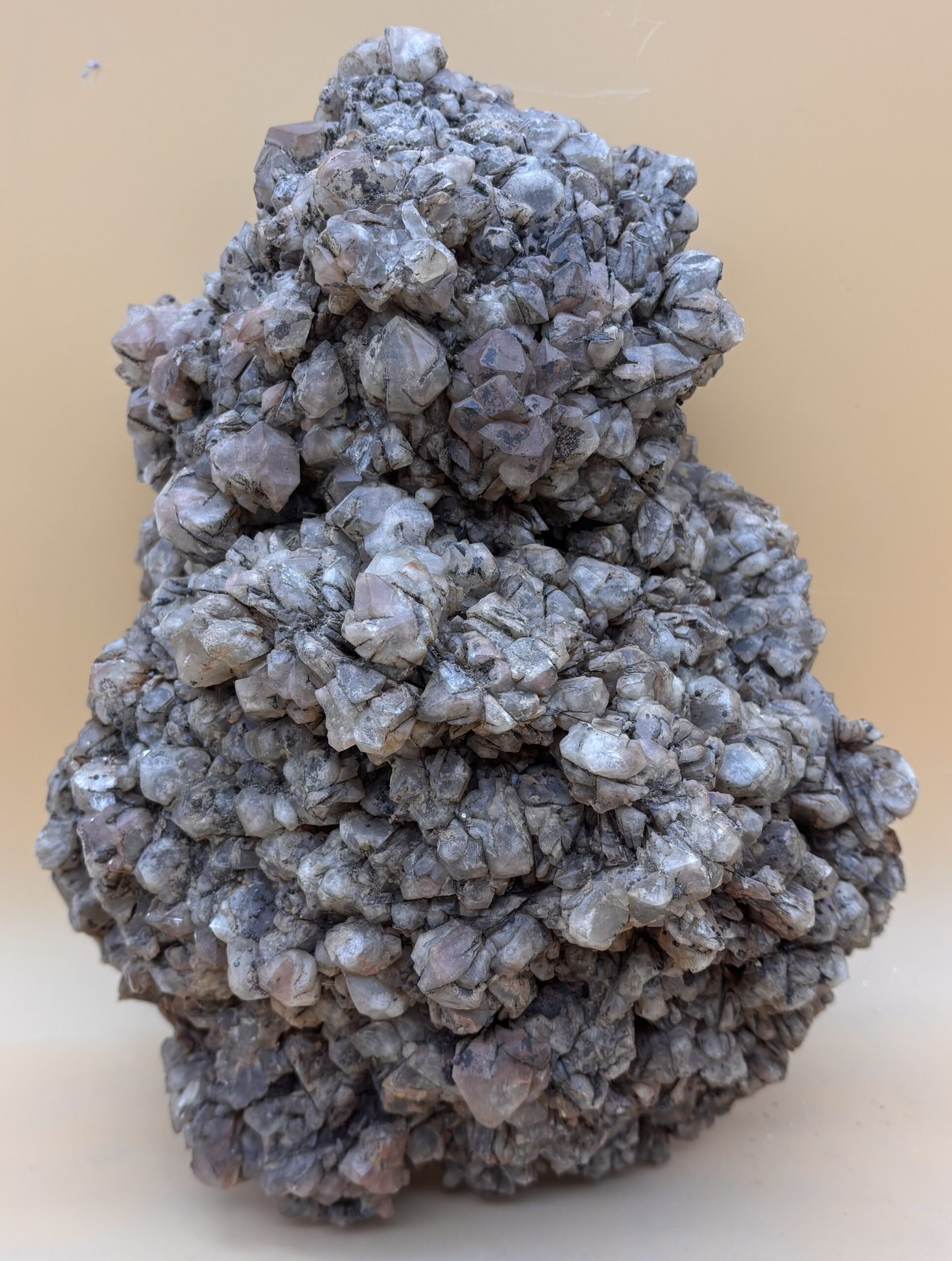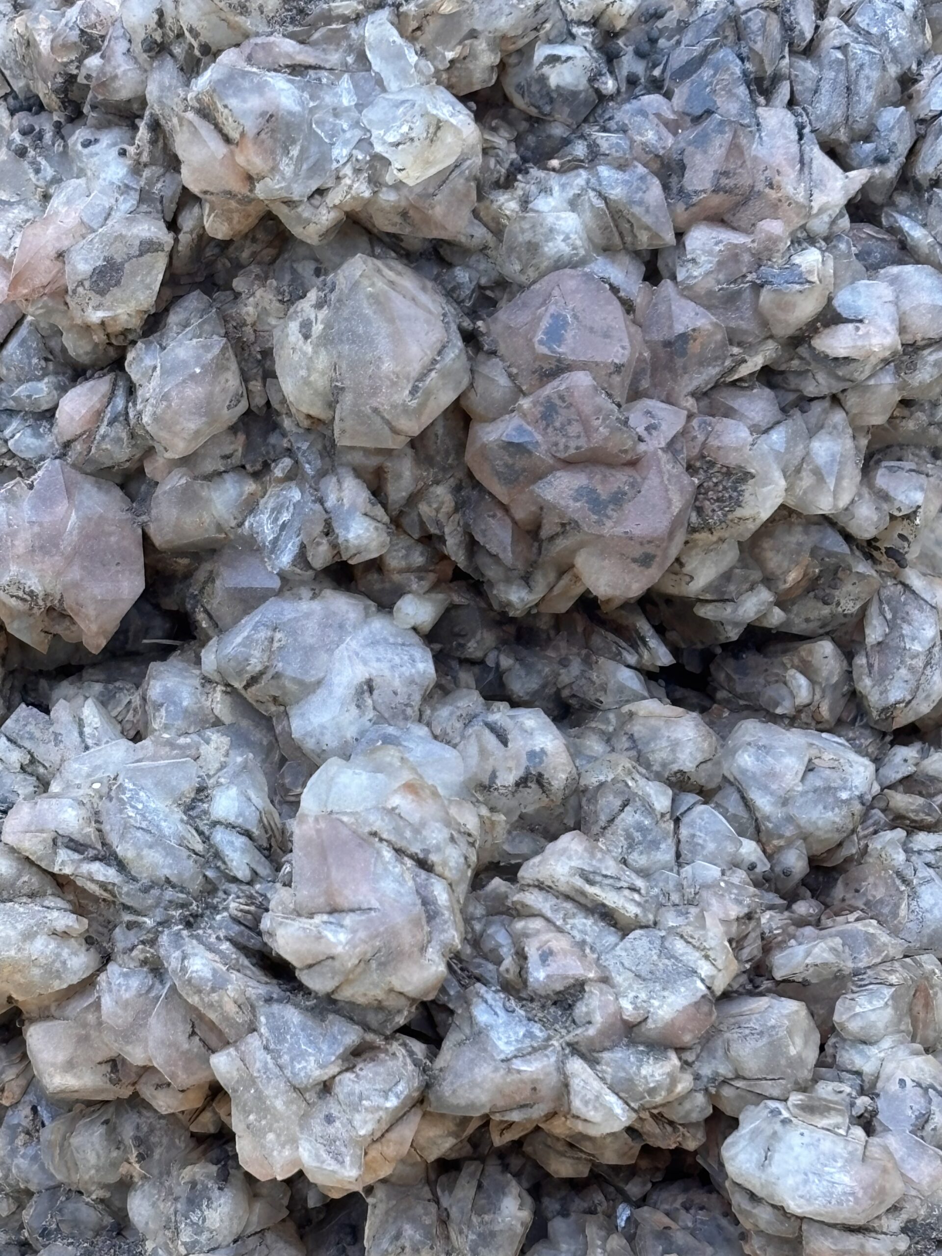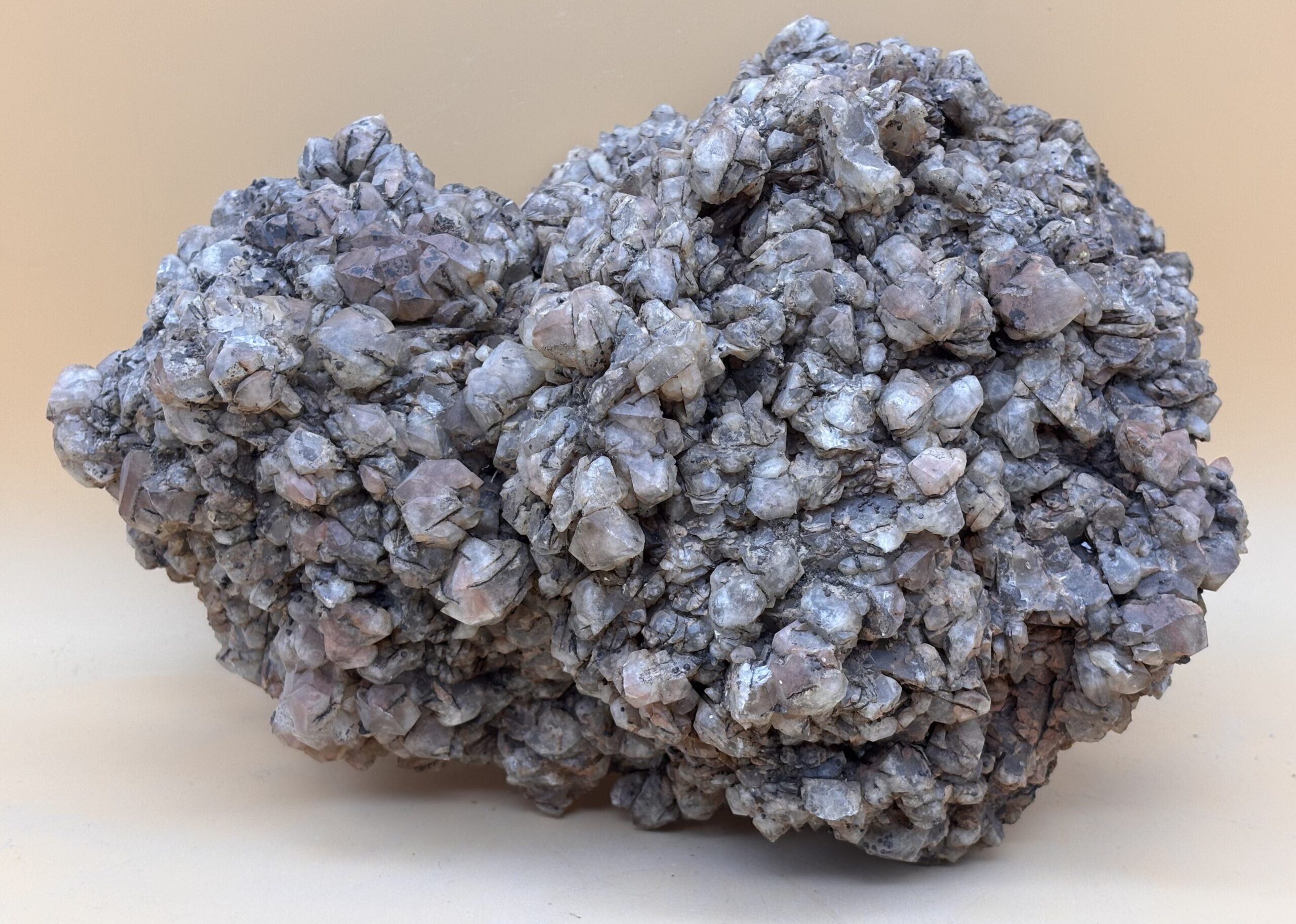 ß-Quarz-Kristall-Aggregat aus dem Outback von Wave Hill Australien, Eigenfund. Diese ß-Quarz-Kristalle wachsen bei über 573 Grad und erhalten so ihre ursprüngliche Kristallform, feine Muskovit-Plättchen sind beim Wachstum mit eingewachsen. Farbe pink-lila-weißlich mit leichtem Oxid-Überzug