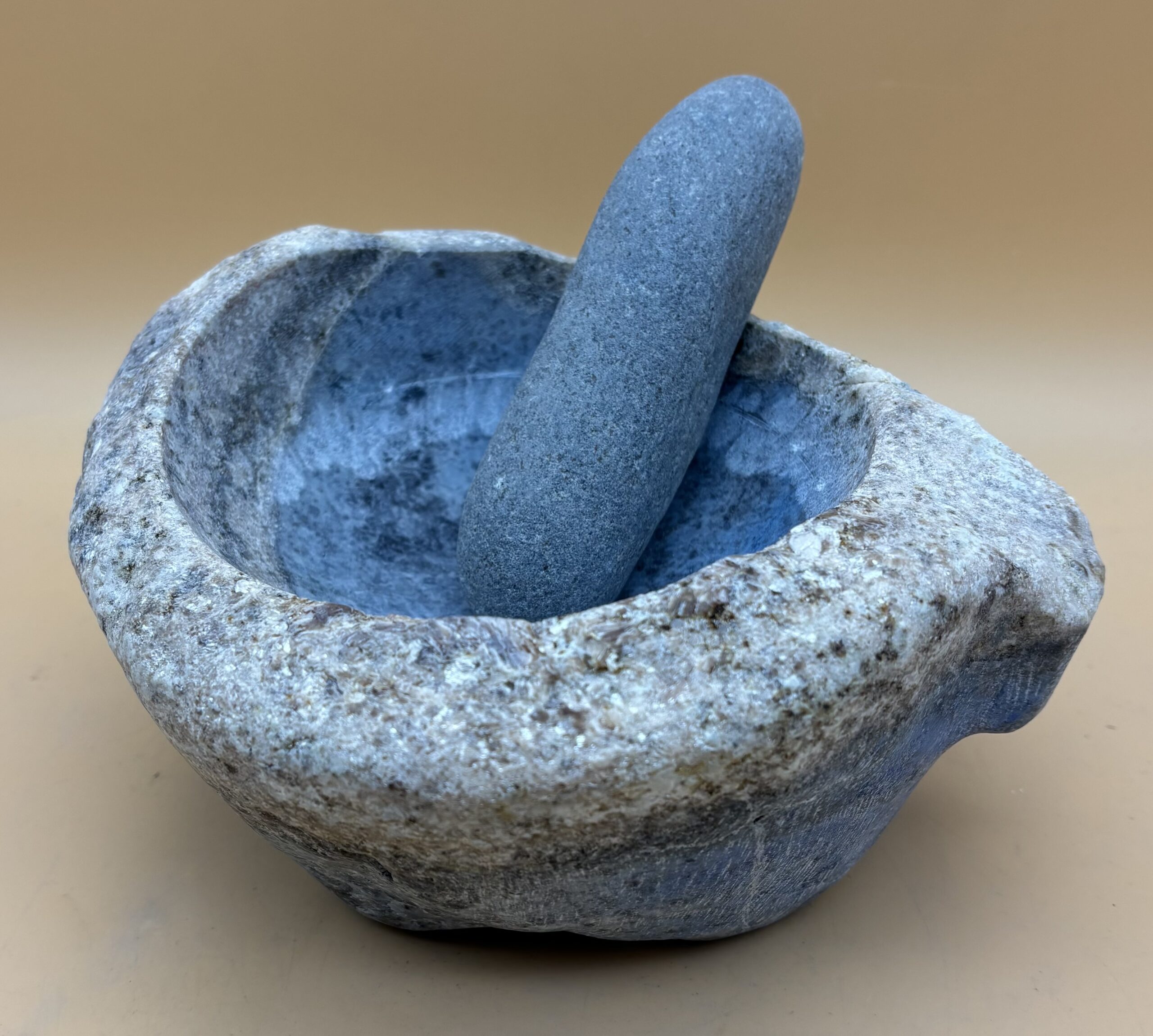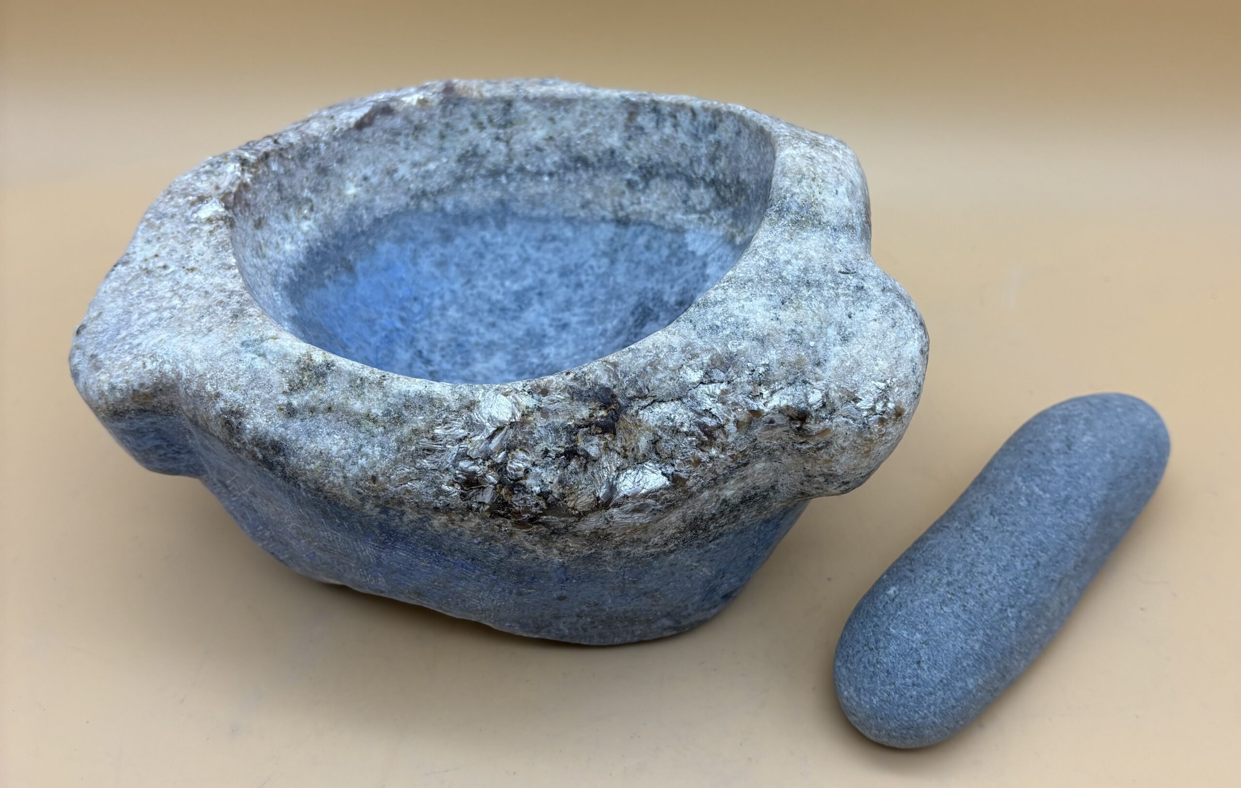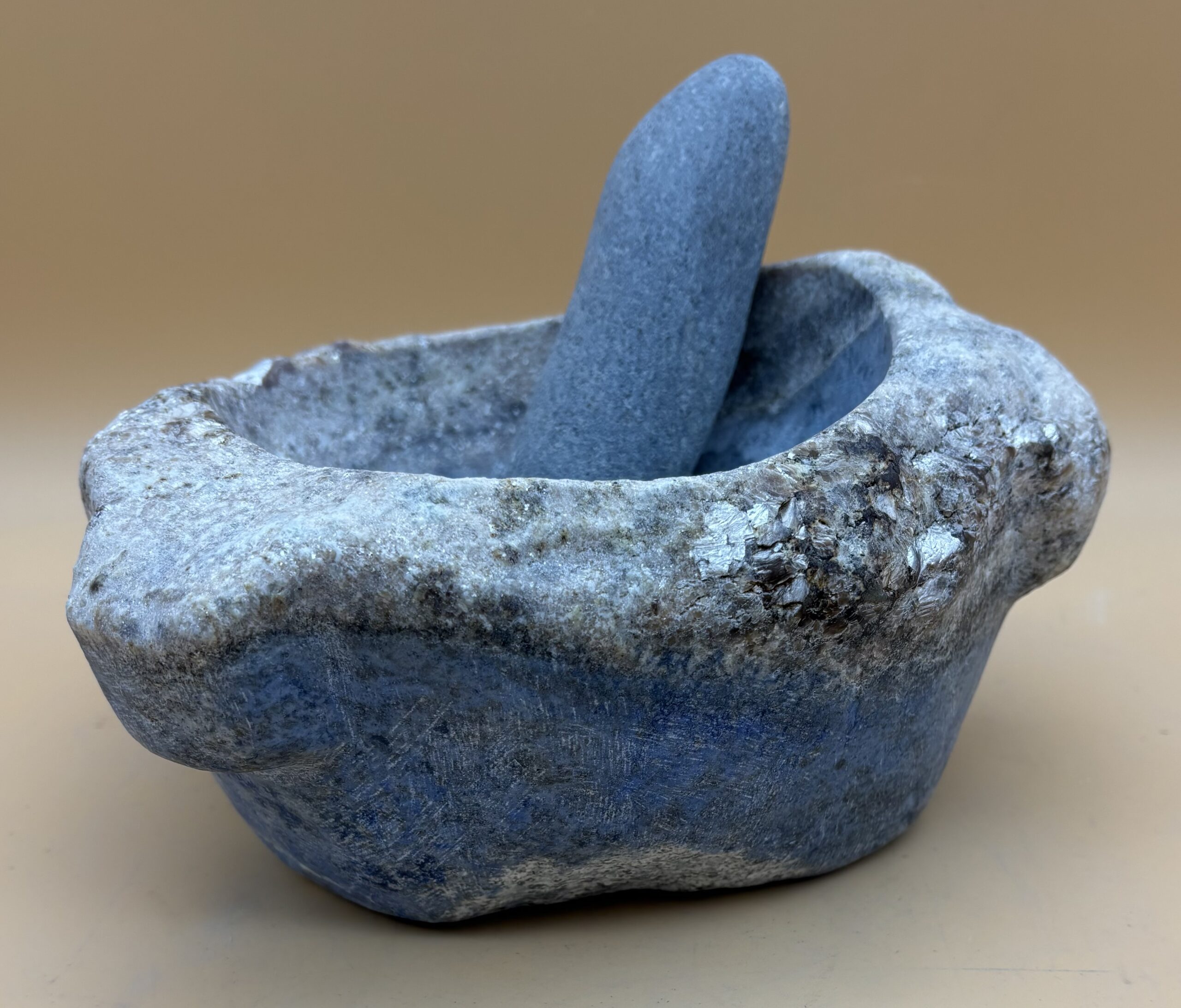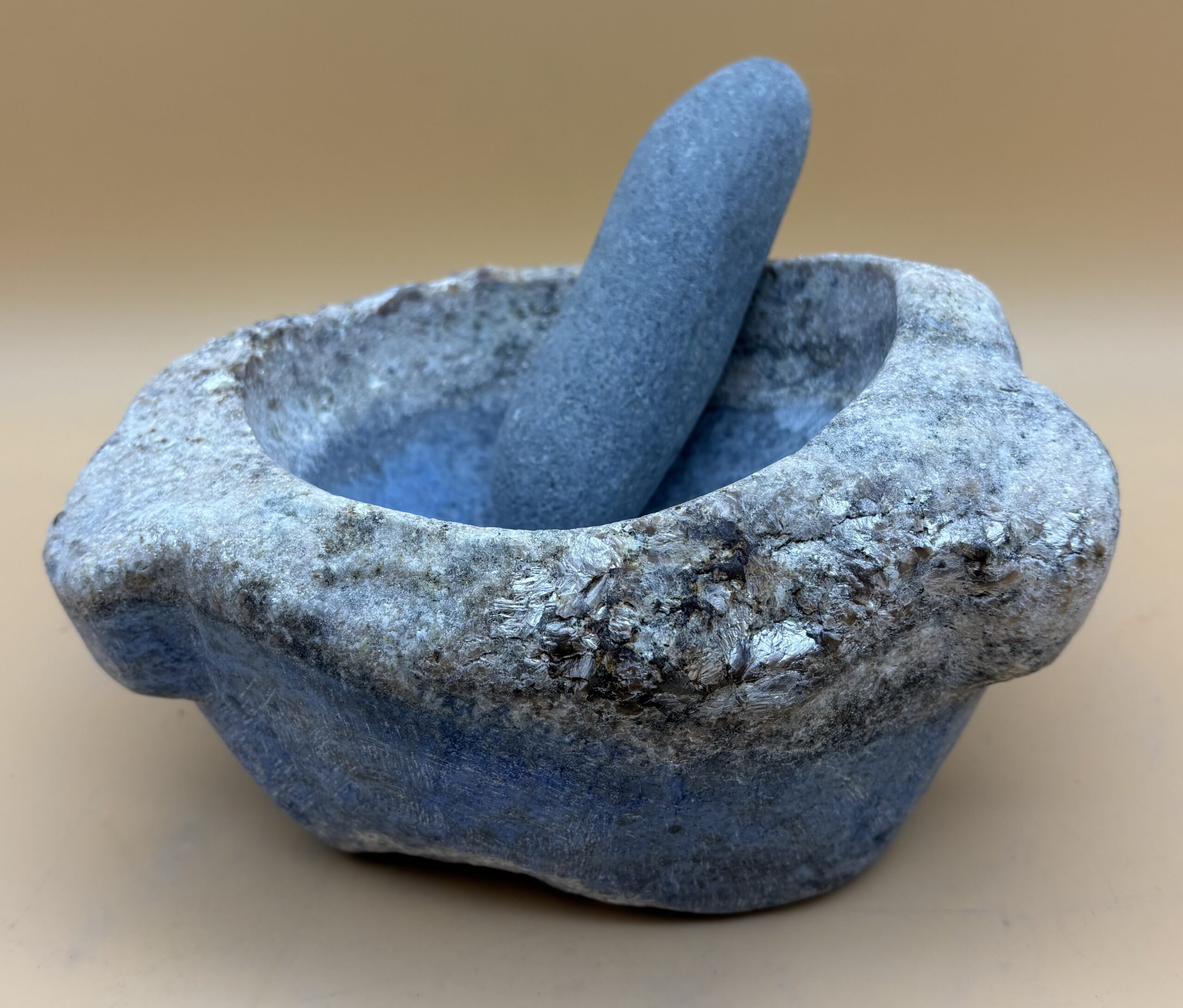 Afghanischer Lapislazuli in Top Form. Bayrisch Blau. Steinmörser aus diesem massivem Edelstein sind selten, darum fertigen wir als Steinverarbeiter und Steinmetze diese Exponate in Handarbeit aus ausgesuchtem Rohmaterial aus Eigenimporten. Hergestellt in Bad Wörishofen. Oberfläche satiniert. Stößel wahlweise aus heimischen Hartholz oder aus Gneis vom Hinterrhein / Graubünden / Schweiz.
