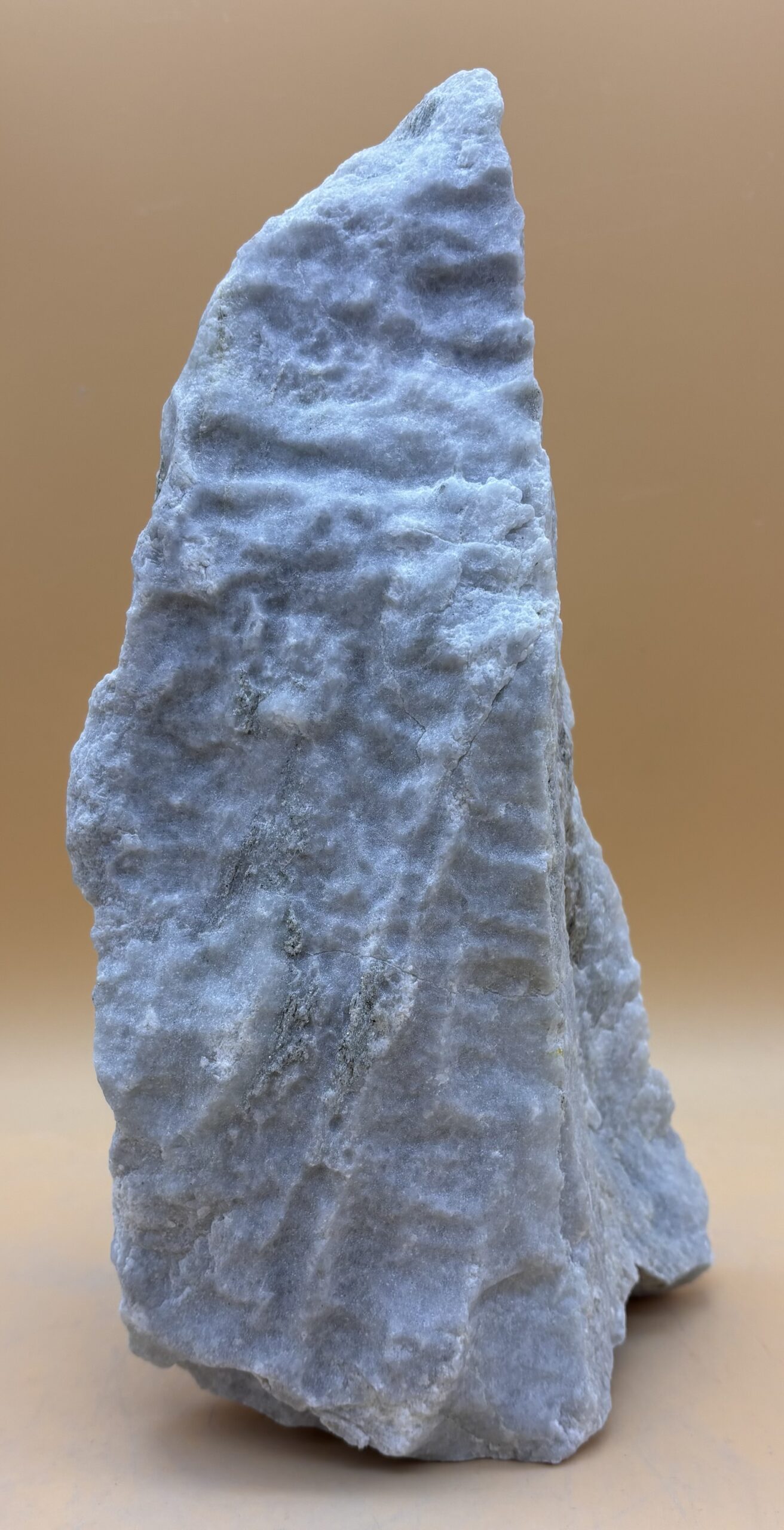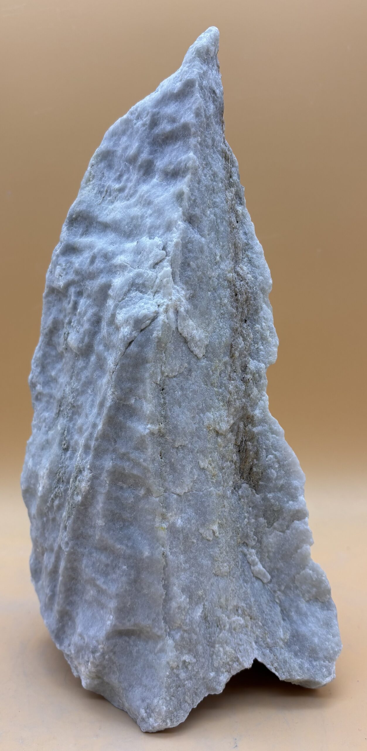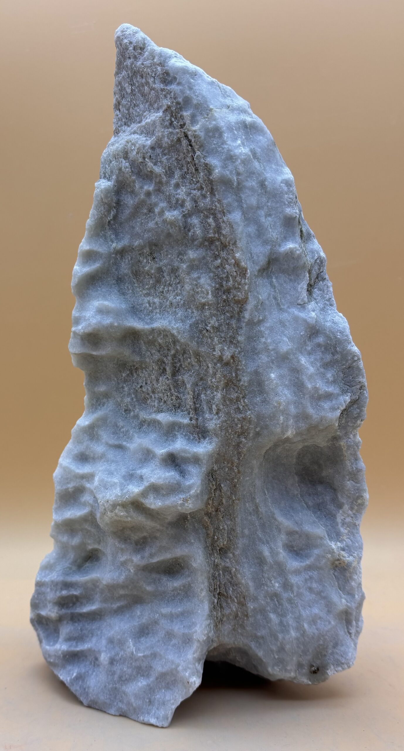 Suiseki in der Japanischen Kultur, sind ausducksstarke Steine die man in Holz- oder Bronzeschalen dekoriert. Dieser Stein, ein Schwarzenbach Dolomit aus dem Wallis CH, erfüllt diese Kriterien mit seinen funkelnden Mukovit Seitenflächen und aus Gletscherwasser erodierten Oberfläche.