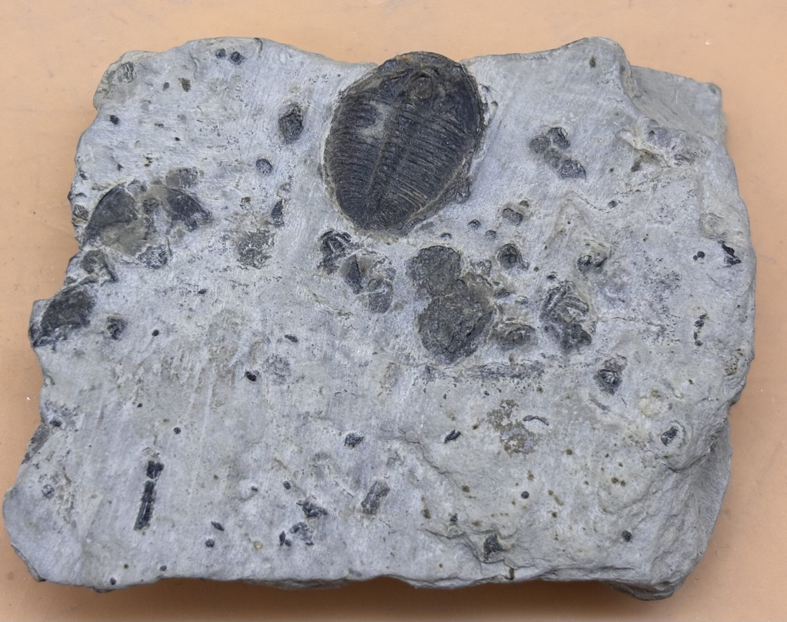 kleiner Trilobit aus dem Kambrium ( 520 - 250 Mio. Jahre ) auf Schiefer. Fundort Süd England