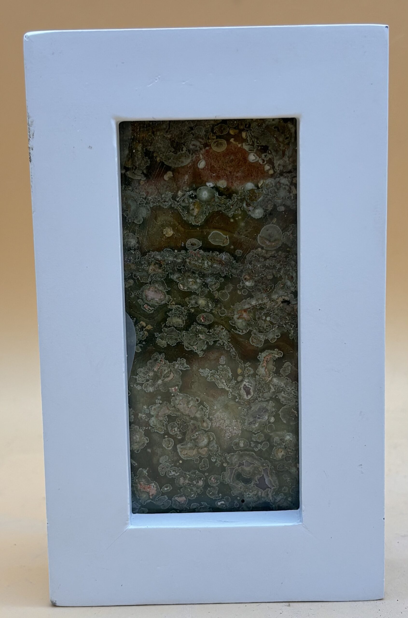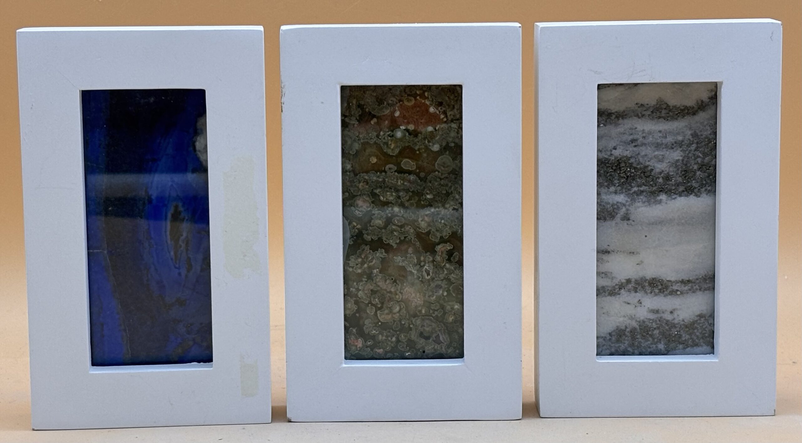 "Trio Struktura" , drei Gesteins-Mineralien aus blauem afghanischem Lapislazuli, grün-rotem Australischem Rhyolith und Walliser Goldmarmor ( Dolomitmarmor ) im Bild festgehalten. Weiß lackierte Holzrahmen mit Glasscheiben geben dem Trio das gewisse Etwas. Für Gesteinssammler das ideale Geschenk. Hergestellt aus Rohstein in Bad Wörishofen / Bayern