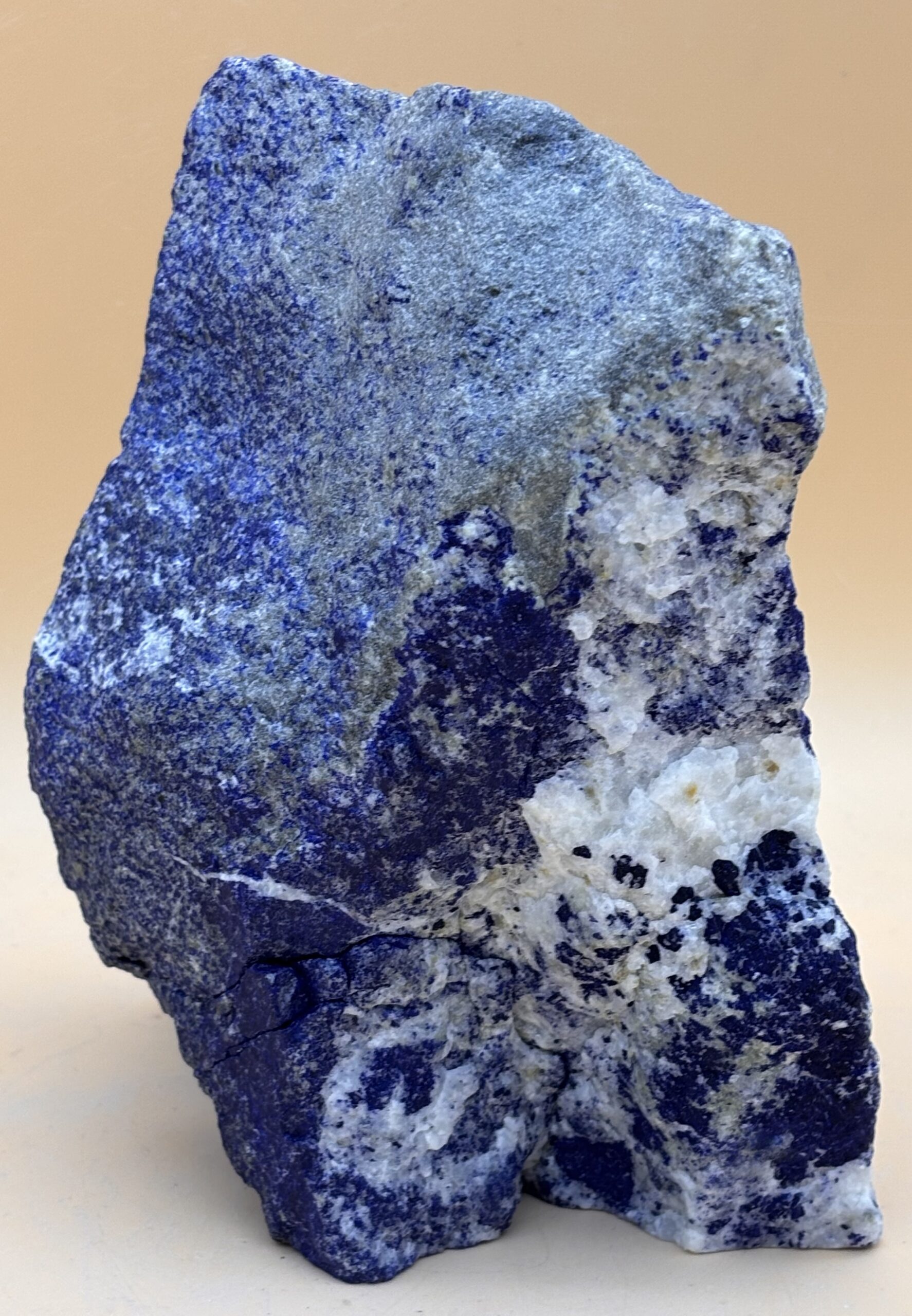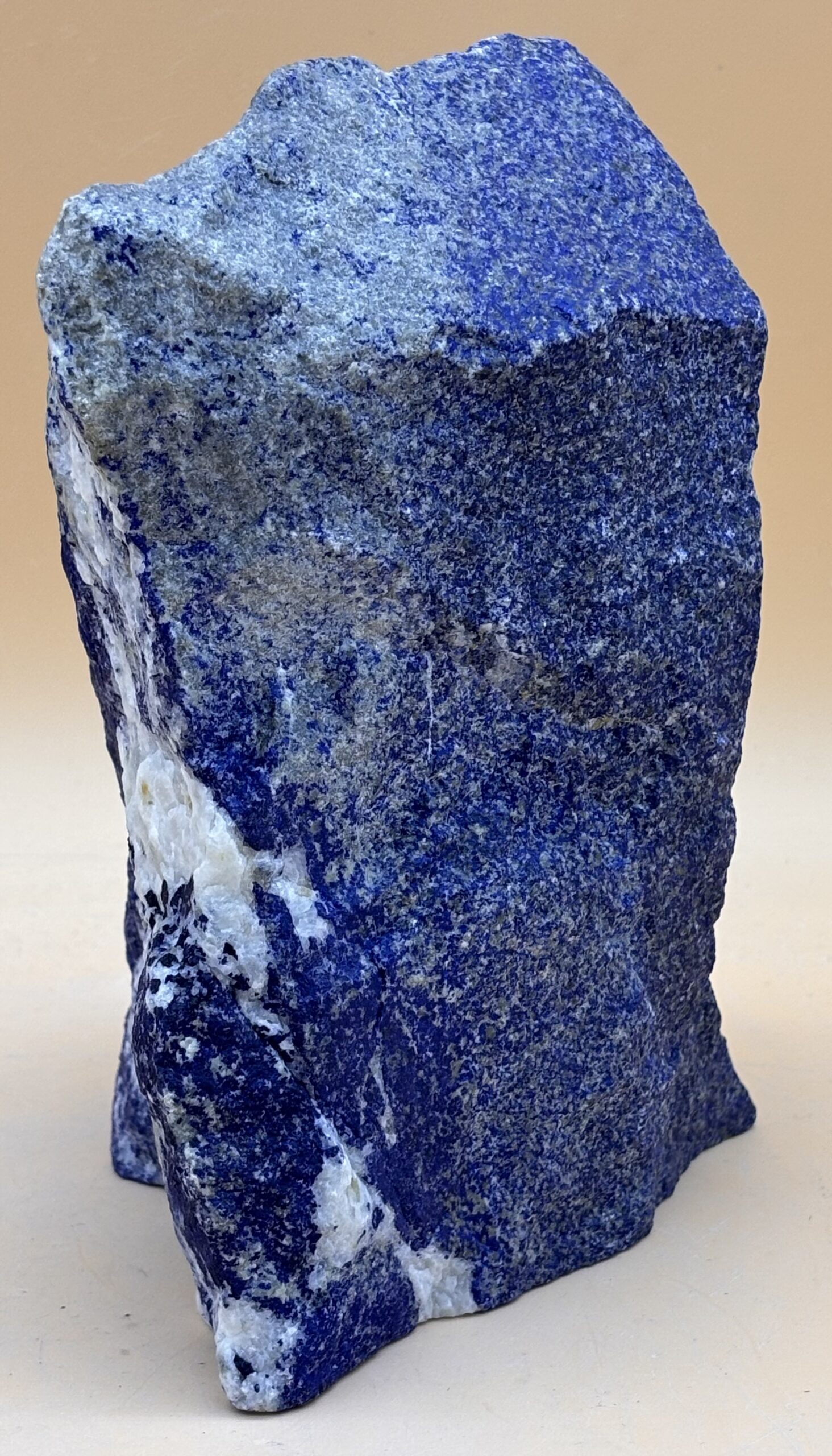 Ultramarin Lapis, Rohstein, Strichfarbe auf rauer Keramik : Blau. Grundstein für die Farbe Ultramarin. Feine Pyrit Anhaftung an der Bruchfläche, Rückseite mit Calcit-kristallisation, oben leichter Übergang zum Nebengemenge Tongestein, gesägte Standfläche