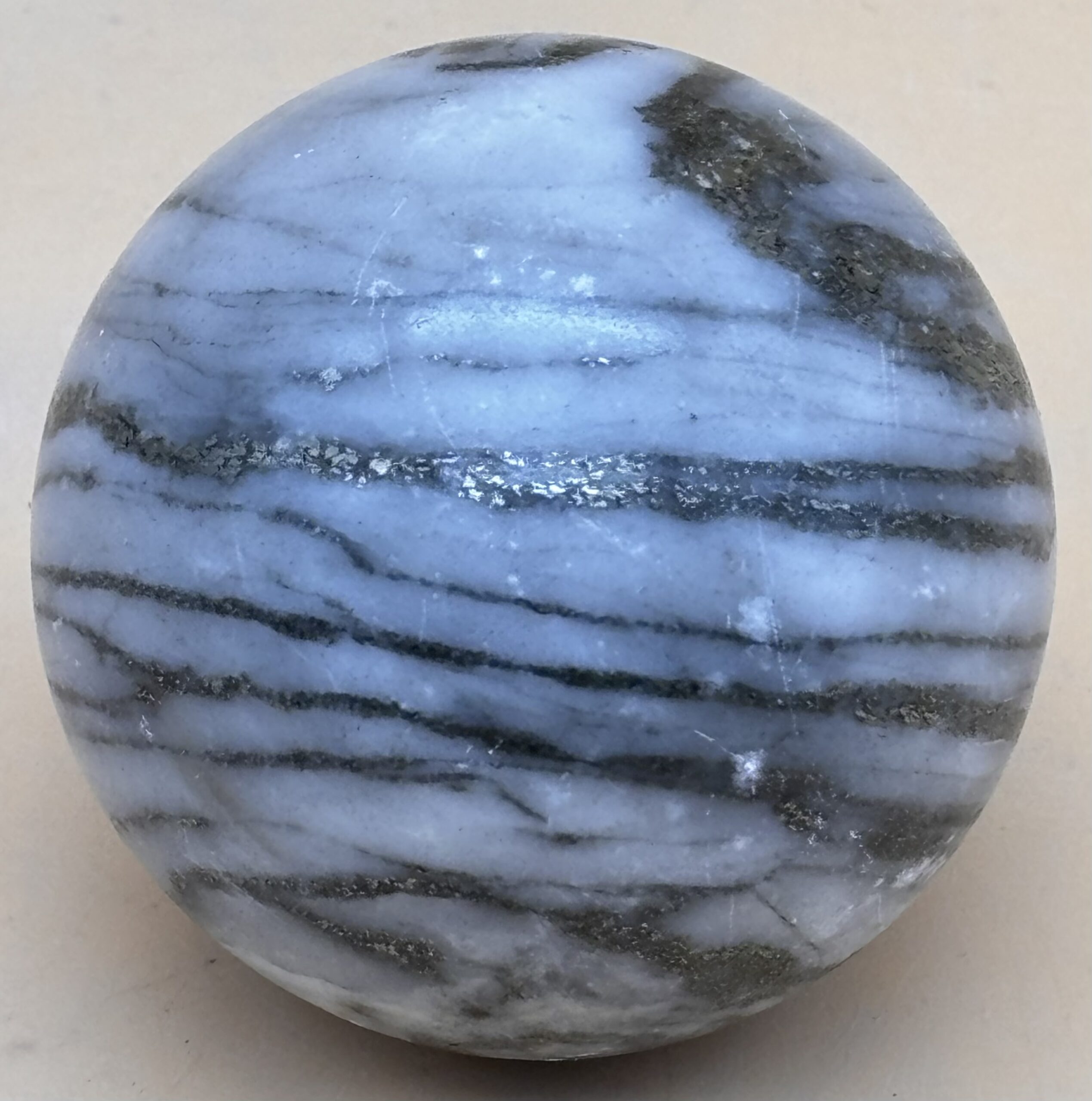 Walliser Goldmarmor Kugel mit polierter Oberfläche, mit ein wenig Fantasie kommt einem eine 8 entgegen. Rohmaterial aus dem Binntal Wallis Schweiz