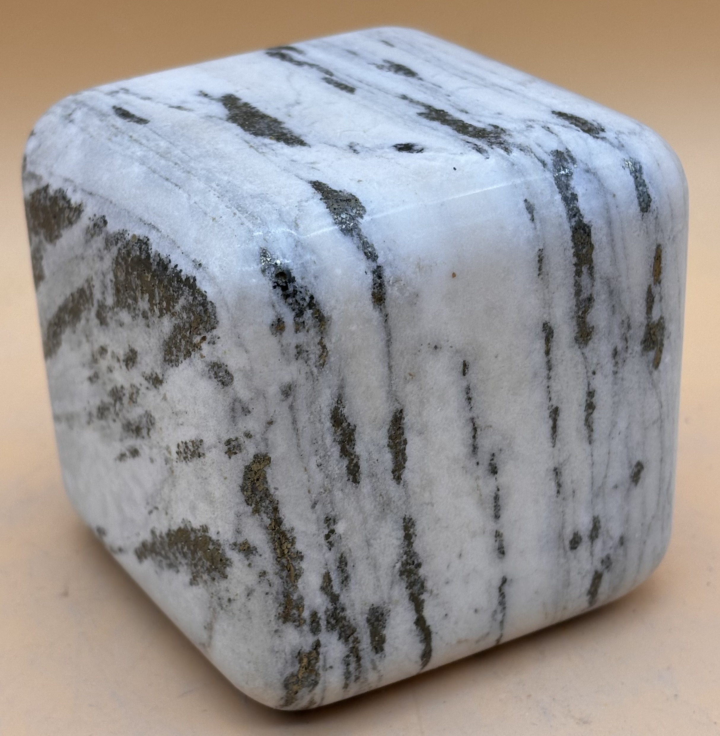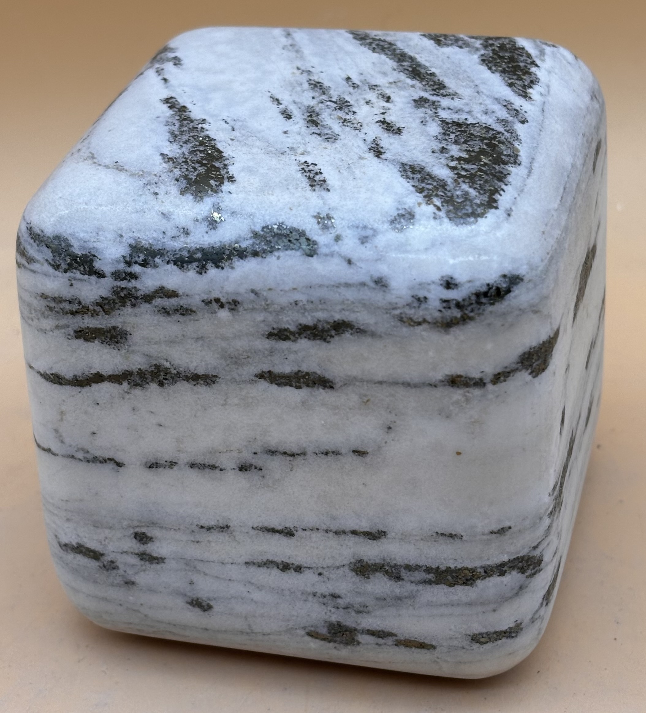 Walliser Goldmarmor ( Dolomitmarmor aus dem Binntal ) Würfel mit abgerundeten und polierten Seitenflächen, Schweizer Handarbeit