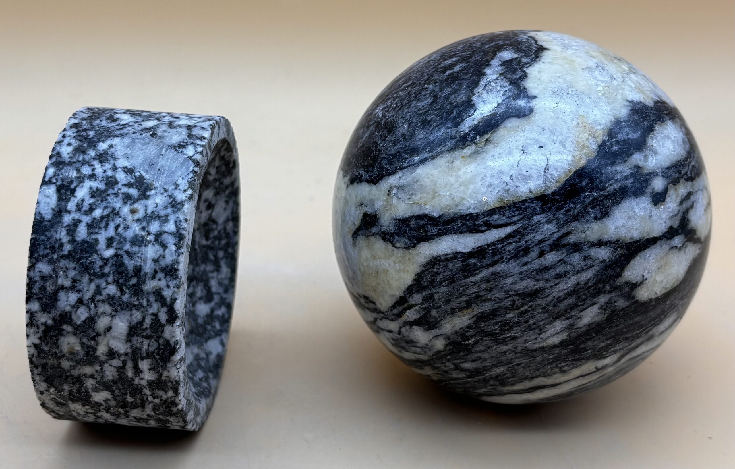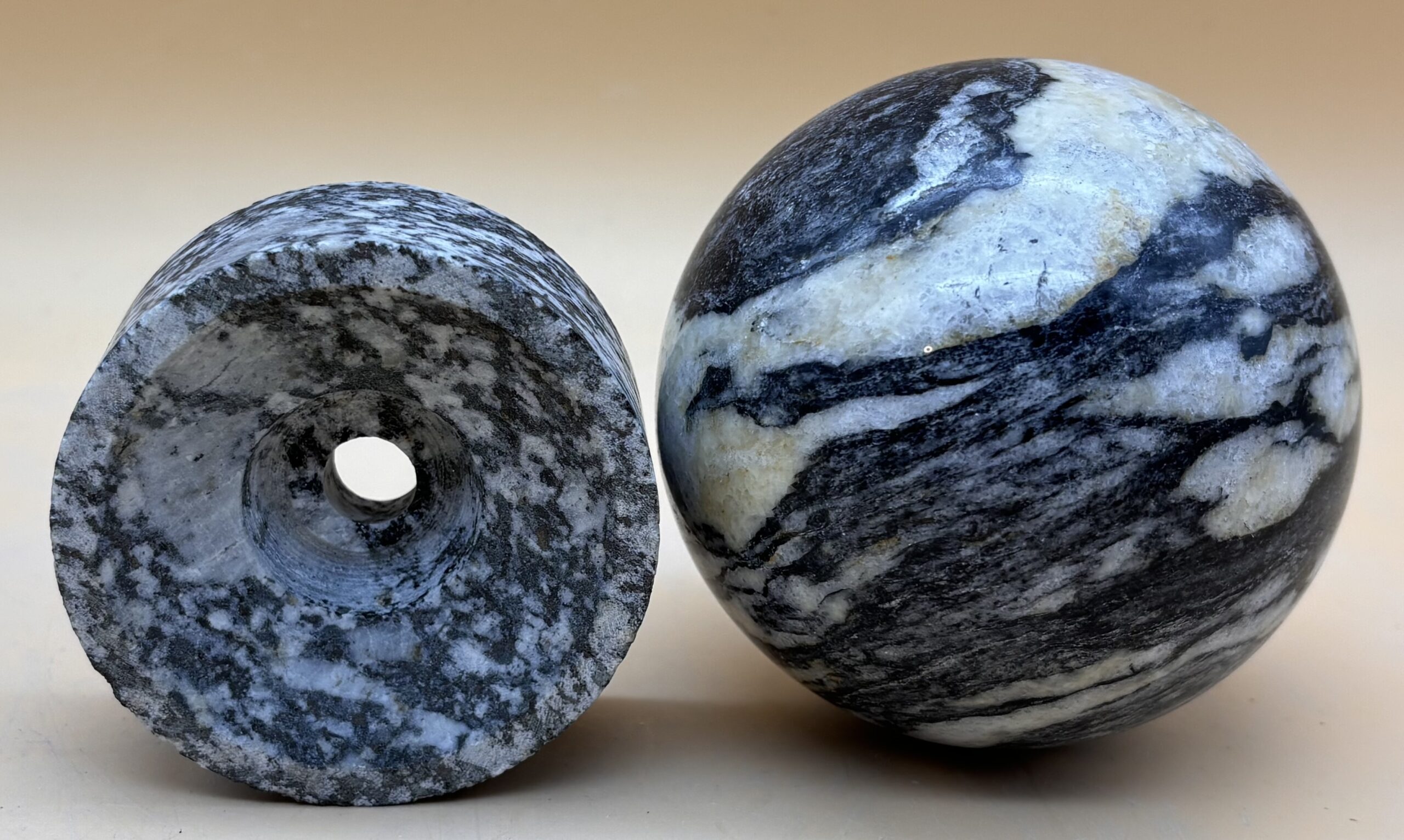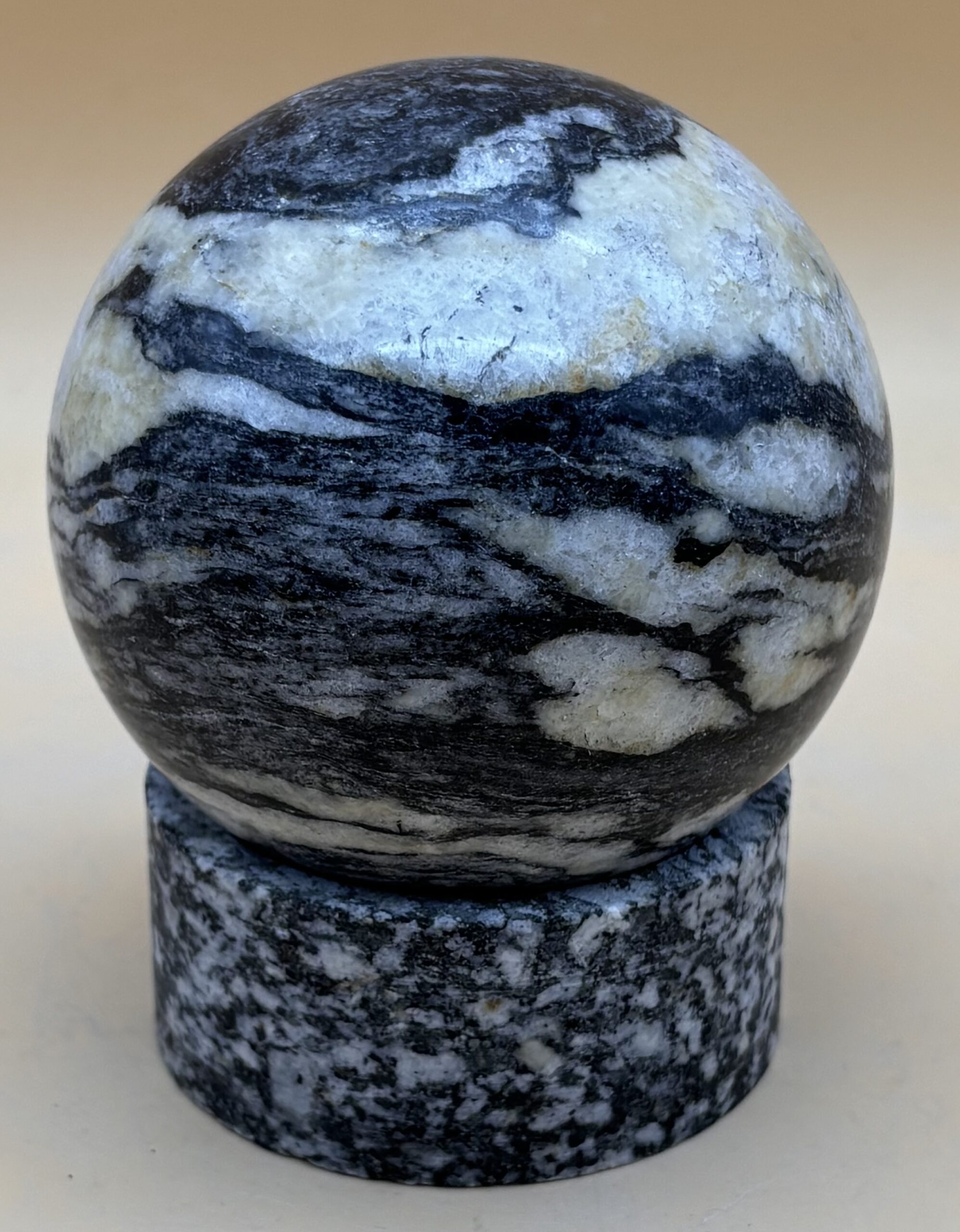 Walliser Metamorphit als schwimmende polierte Kugel für einen Zimmerbrunnen, mit Kugelbasis aus Granit. Herkunft Rohmaterial Kugel : Binntal Wallis Schweiz, Lieferung Kugel mit Basisstein
