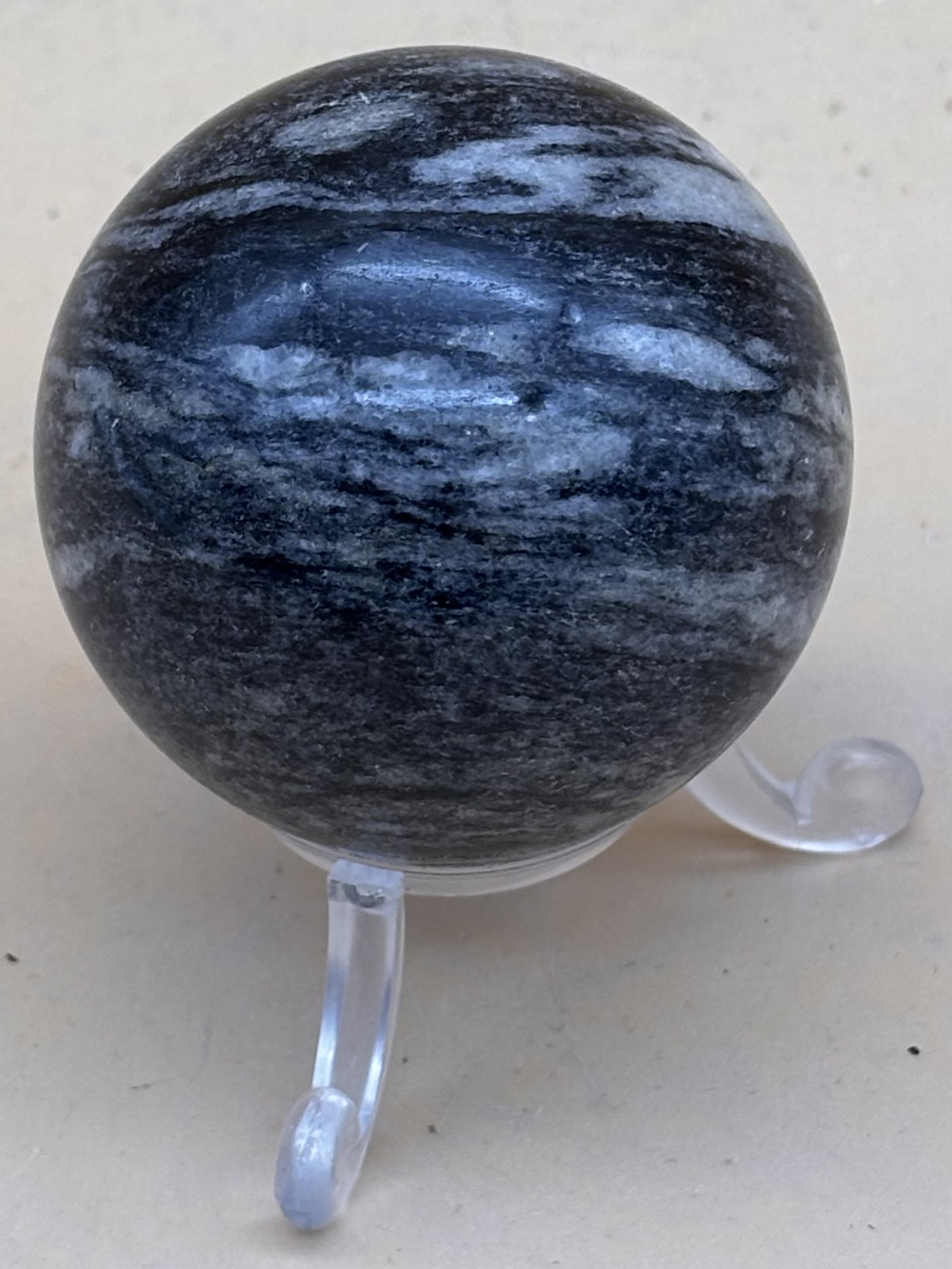 aus dem Walliser Binntal kommt dieses gebändert-gewolkte Hartgestein. Außen als Rohstein hell-gelb von Eisenreichen Sanden gefärbt, zeigt sich innen die ursprüngliche Farbe des dunklen Metamorphit. Steinkugel Oberfläche poliert