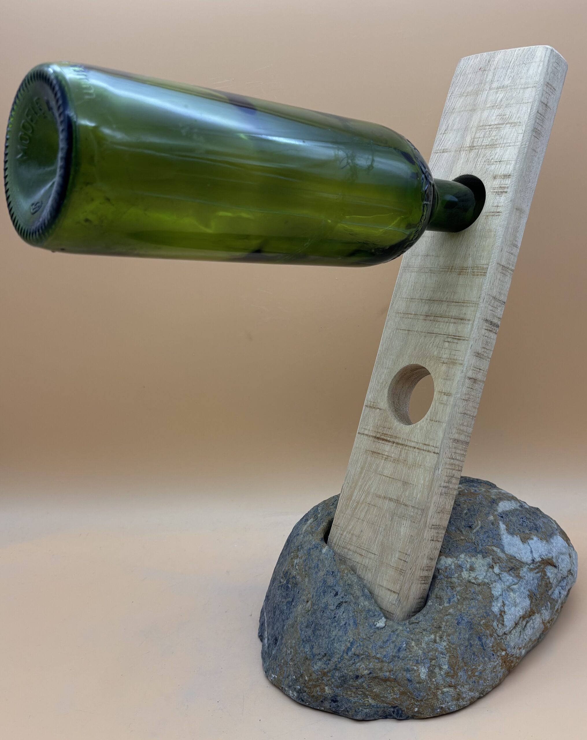 Weinständer "Binn", aus nachhaltigem Rohstoffen zusammen gesetzt. Binn-Gletscherkiesel aus Serpentin und Harras-Holz