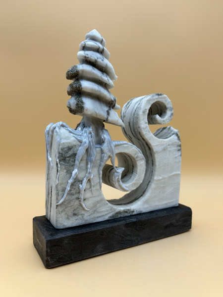 Wellen aus Luft und Wasser. Bäume erzeugen Luft zum Atmen, Luft bewegt Wasser, Wasser brauchen Bäume um zu Wachsen und Luft zu erzeugen. Bäume absorbieren Wasser in die Atmosphäre. Ein Kreislauf der Elemente, Symbolisiert in Schweizer Goldmarmor aus dem Binntal. Art Design von Bildhauer Peter Fraefel Bad Wörishofen. Unikat