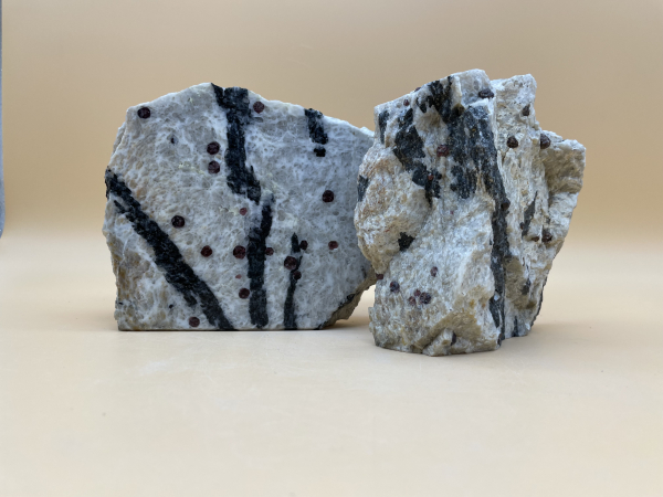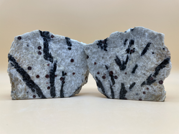 Eigenfund vom Erongo/Namibia, eine Matrix aus weißem Feldspat und Quarz geben dem schwarzen Turmalin/Schörl und dem roten Granat sein strahliges Aussehen. Rohstein mittig gesägt und poliert. Bearbeitet in Bad Wörishofen. Unikat