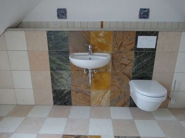 Ein Gäste WC mal etwas anders. Wie elegant verschiedene Natursteinsorten zu kombinieren sind ist hier zu sehen.