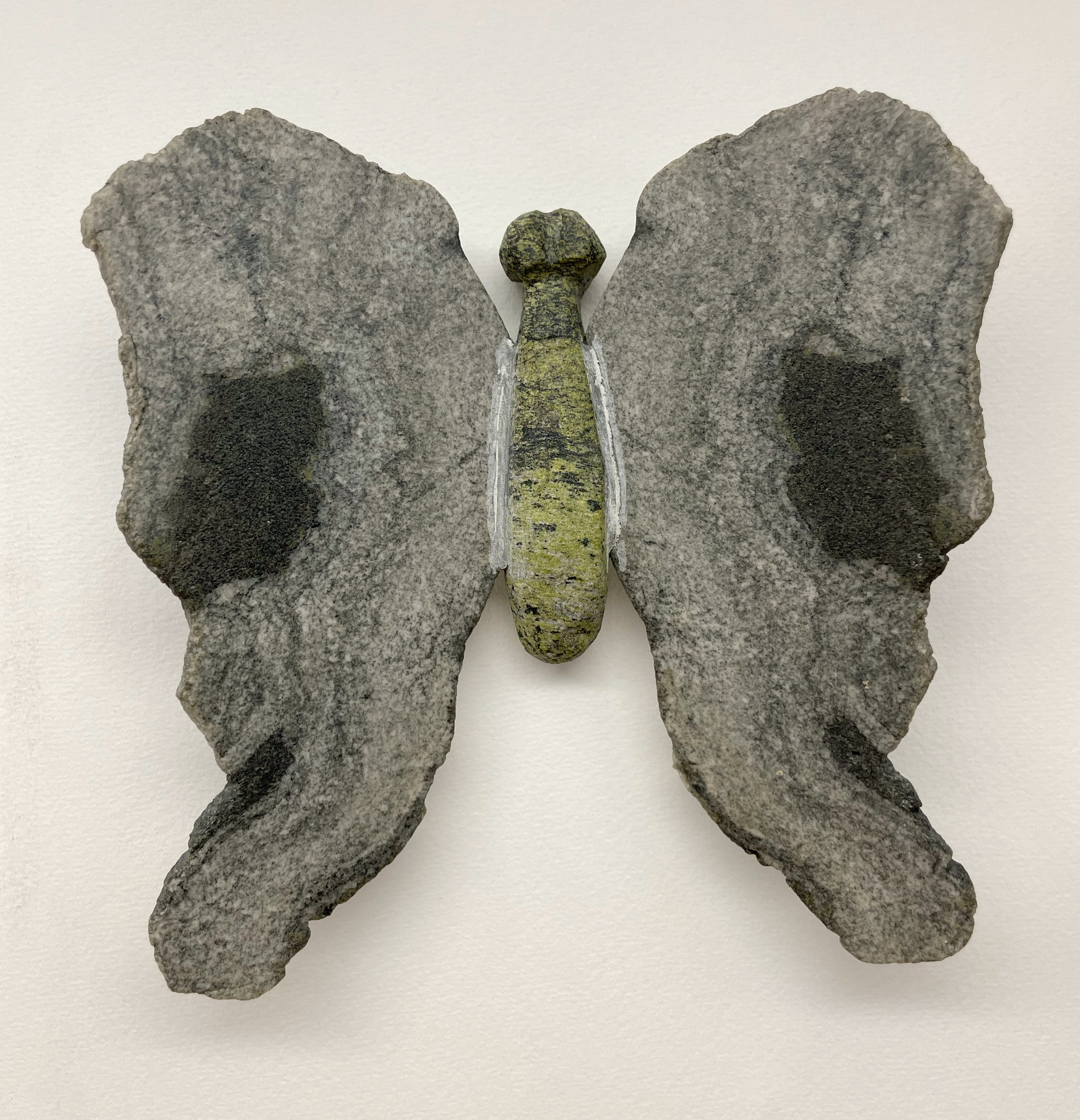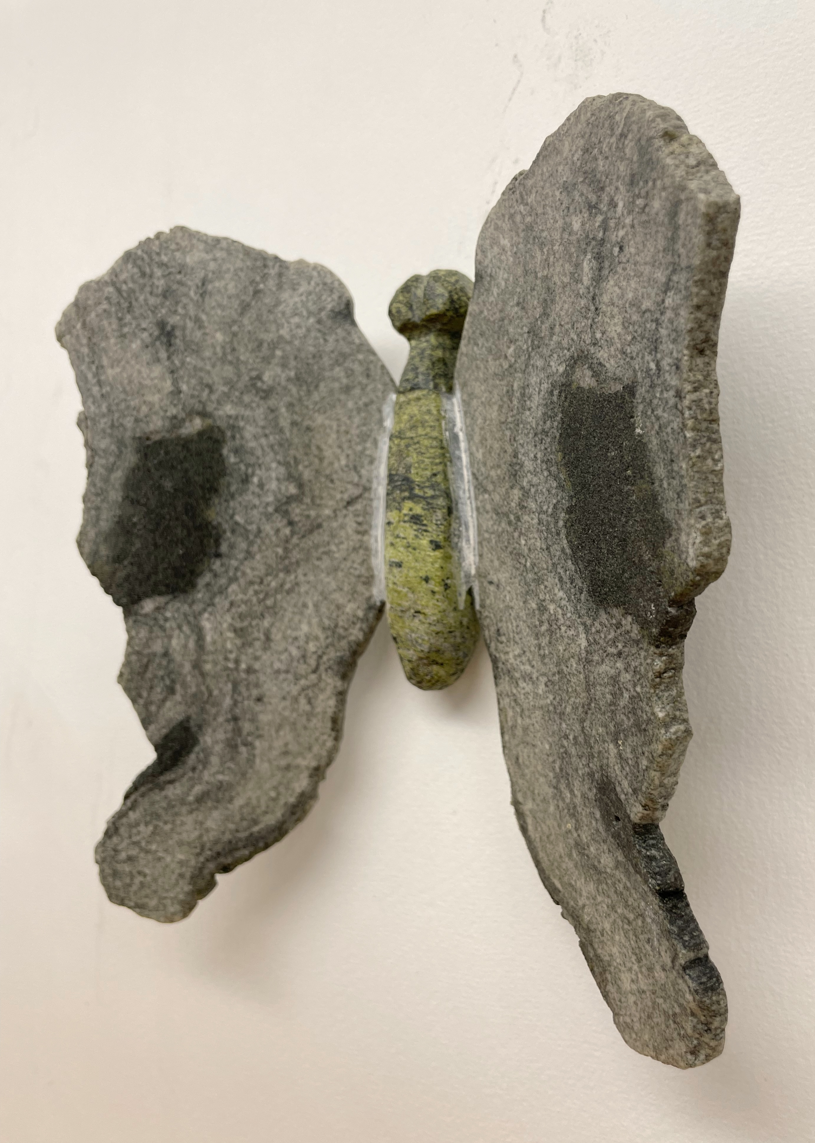 Aus Gestein etwas zu schaffen und wenn es noch so unscheinbar ausschaut, das ist die Kunst. Ein abgerolltes Geröll aus Binntaler Gneis und eine Felsnadel aus Epidot lässt diese Metamorphose entstehen, wenn einem die Fantasie beflügelt. Dieser Schmetterling aus massivem Stein der Schweizer Alpen haftet auf allen Eisenhaltigen Untergründen mit seinen zwei starken Neodym-Magnete. Idee und Herstellung Fa. Peter Fraefel. Unikat
