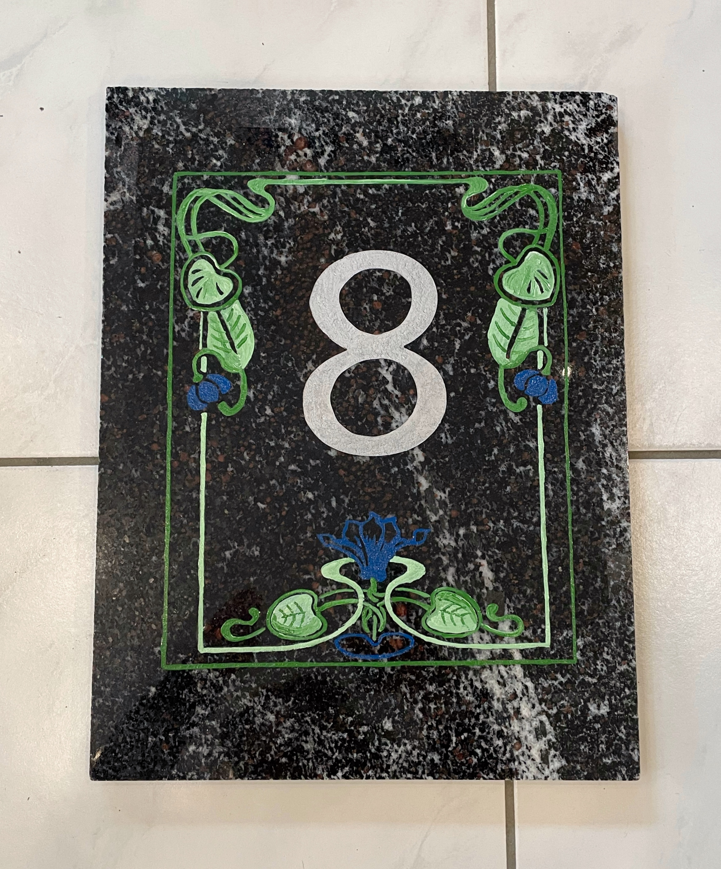 Individuelle Hausnummer mit farbig coloriertem Rahmen auf Norwegischen Granat-Glimmer-Gneis „Norwegian Sunset“. Oberfläche poliert. Andere Hausnummern möglich. Befestigung mit Winkelhaken oder mit Bohrungen für V2A-Schrauben. Andere Plattengrößen möglich. Handarbeit aus Bad Wörishofen. Unikat Größe: L/B/H 30/40/2 cm