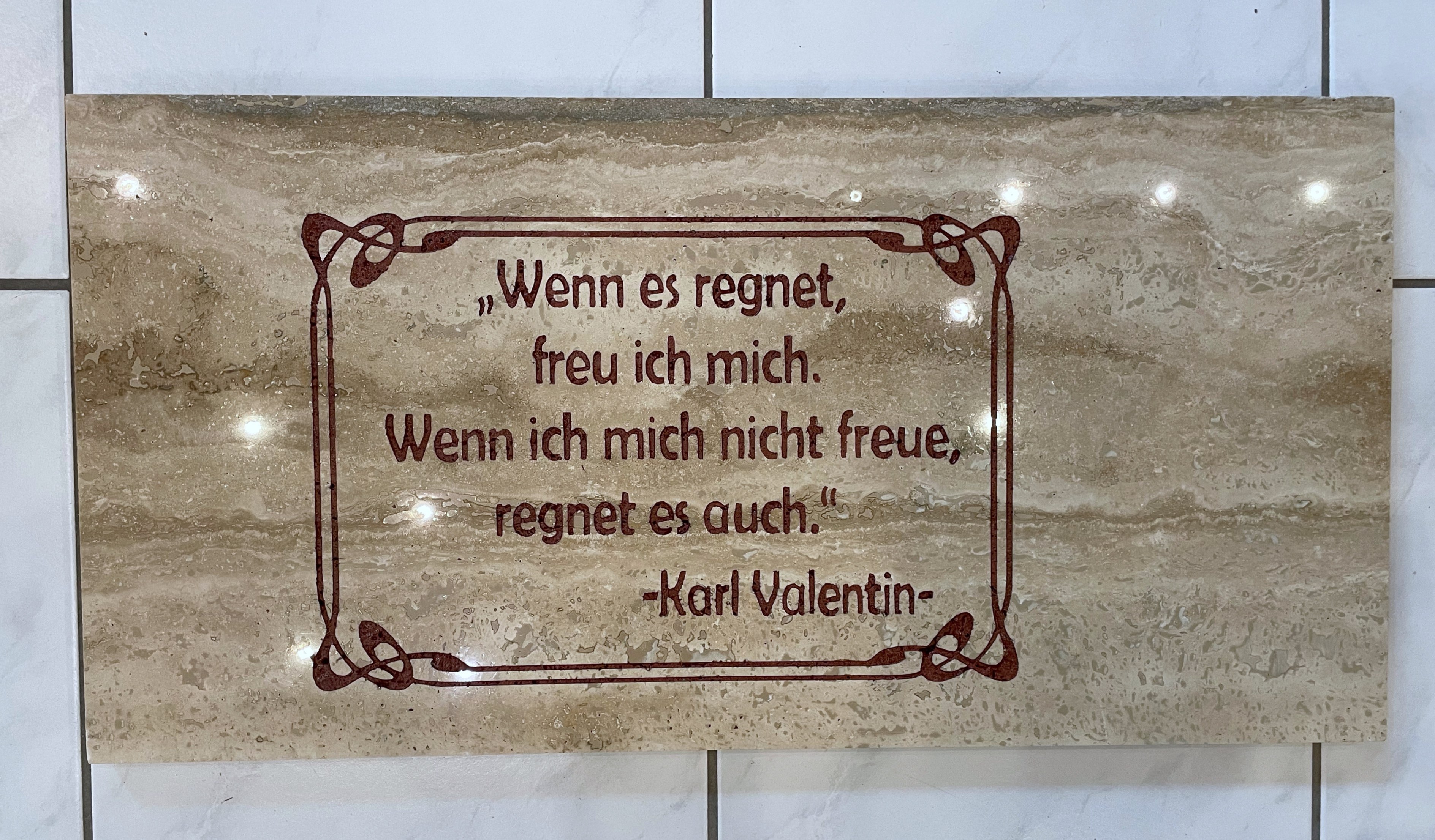 Schlauer Spruch von Karl Valentin auf römischen Travertin „Wenn es regnet, freu ich mich. Wenn ich mich nicht freue, regnet es auch“. Oberfläche poliert. Befestigung mit Winkelhaken oder individueller Bohrung. Andere Plattengröße möglich. Handarbeit aus Bad Wörishofen. Unikat Größe: L/B/H 65/35/2 cm