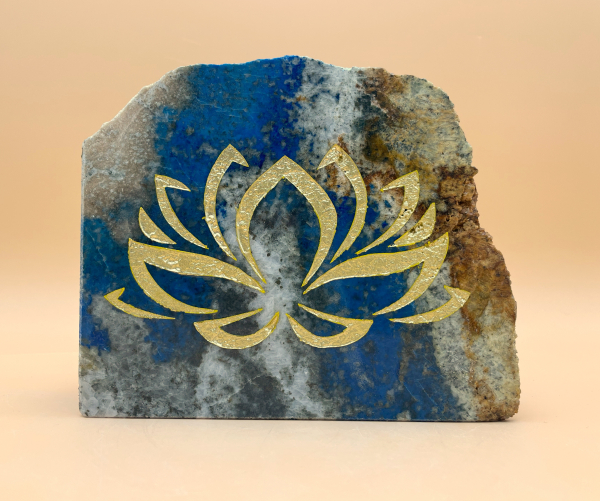 Lotusblüten-Relief, Messing beschichtet, auf polierten Lapislazuli, Rückseite poliert, auch als schöne Buchstütze geeignet. Handarbeit aus Rohmaterial in Bad Wörishofen. Unikat