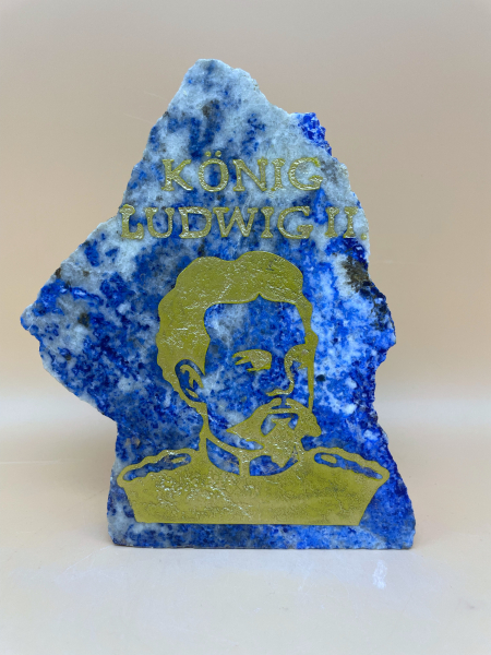 Nichts auf dieser Erde ist so bekannt wie seine Schlösser. Schloss Neuschwanstein in Füssen ist davon wohl das Highlight. Ludwig II war kein Herrscher wie wir sie aus der Geschichte kennen, er war ein Mensch mit Visionen und hatte dabei die Realität verdrängt. Seine Bautätigkeit war zur damaligen Zeit im 19th kostspielig und so manches Bauvorhaben war wegen Geldmangels zum Scheitern verurteilt. Aber was wäre heute Bayern ohne seine Schlösser? Seine Bauten brachten bis jetzt dem Bayerischen Freistaat mehr Geld ein als sie zur damaligen Epoche gekostet hatten. Dieses Relief ist ein Dankeschön an den Märchenkönig, natürlich in den Bayerischen Nationalfarben Weiß-Blau. Eingearbeitetes feines Relief in echten Lapislazuli, Oberfläche poliert, M-vergoldet, Rückseite Natur. Hergestellt im Bayerisch-Schwäbischen Bad Wörishofen. Unikat