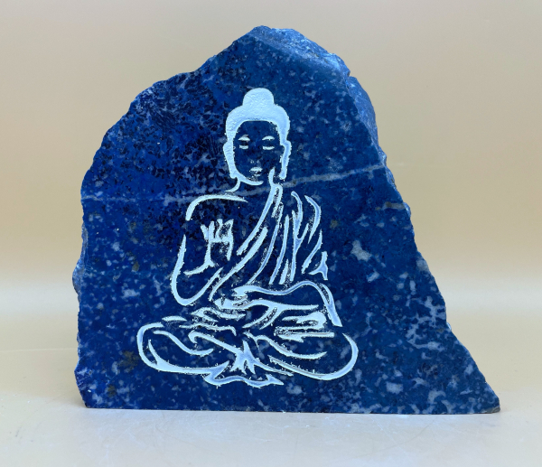 Per Hand eingearbeitete Buddha-Silhouette in massiven ungefärbten Lapislazuli, auch als Ultramarin bezeichnet. Oberfläche poliert, Buddha weiß getönt, Rückseite Natur pur, Hergestellt in Bad Wörishofen. Unikat Gewicht: 1,17 kg Größe: L/B/H 15/4/14 cm