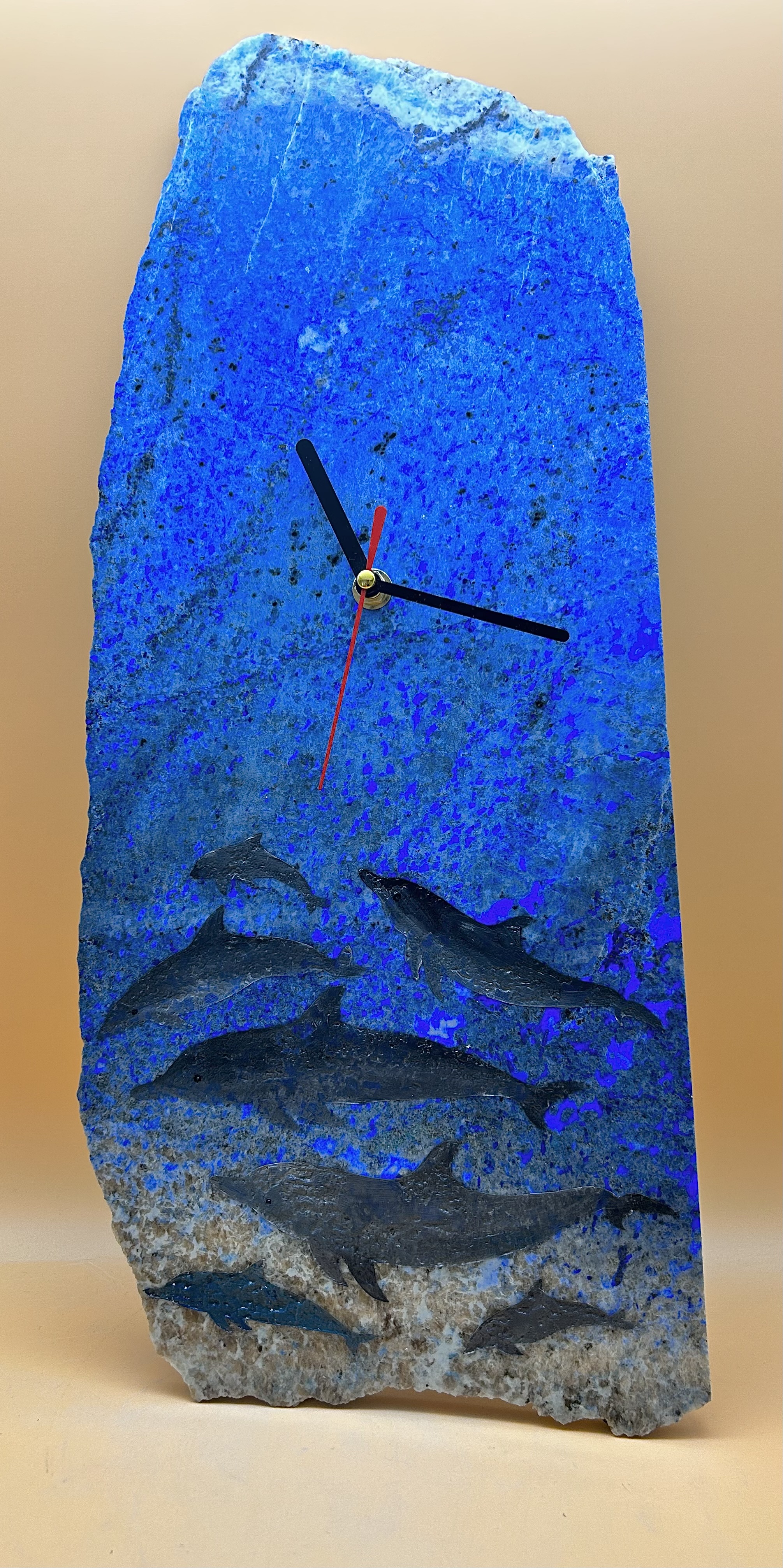 Geschnittene und polierte Ultramarin / Lapislazuli große Gesteinsplatte mit colorierter Delfin-Schule, feines Uhrwerk mit durchlaufendem Sekundenzeiger, Hergestellt in Bad Wörishofen, Lieferung ohne Batterie. Unikat