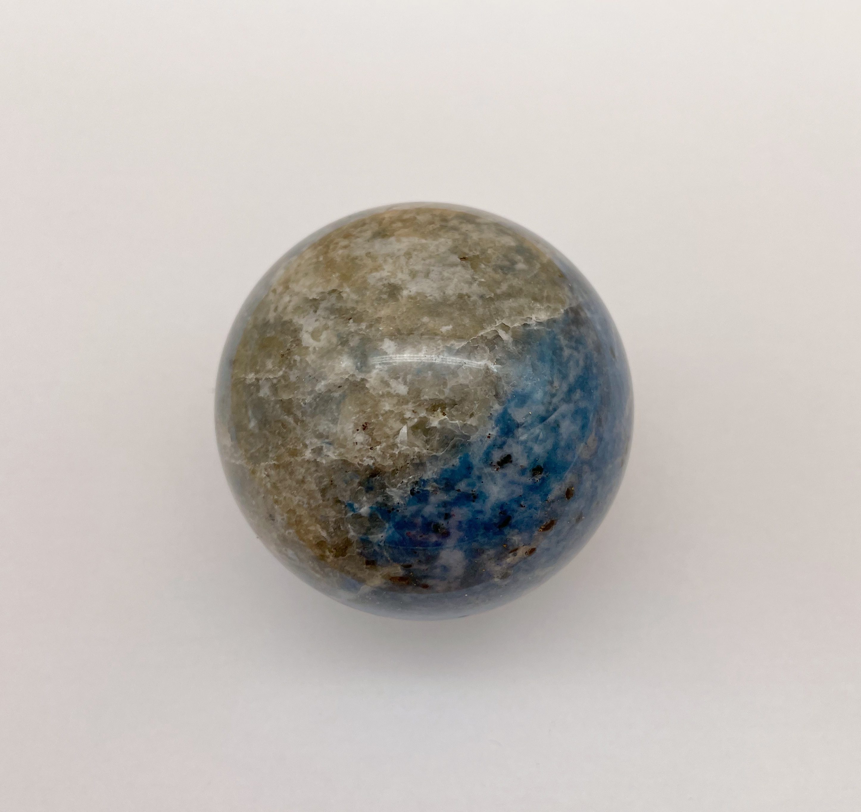 Als „Poch“ wird in Australien das Muttergestein in den Opalminen bezeichnet. Beim Lapislazuli gibt es keine Bezeichnung dafür, darum nennen wir diese Gesteinsoptik Lapis-Poch, da einst heiße hydrothermale Lösungen in Kalkstein eingedungen sind und durch Druck und Hitze in einer Metamorphose zusammen auskristallisieren konnten. Diese Abbau-Minen befinden sich am Hindukusch auf über 4000 Meter. Hergestellt aus Rohstein in Bayern. Unikat Gewicht: 525 g Größe: d 6,5 cm
