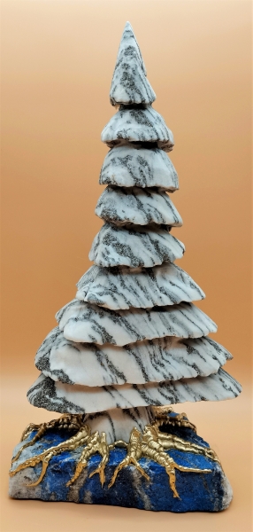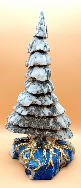 Großer Walliser Goldmarmor-Binntree mit M-vergoldeten Wurzeln auf massiven Ultramarin-Lapis. Oberfläche jetgestrahlt. Kein Baum ist wie der Andere. Ein echtes Schaustück. Signiert und Nummeriert Steinbildhauermeister P.Fraefel. Unikat