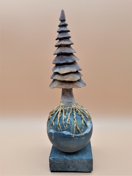 Symbol für eine Grüne Erde. Pflanzen und verwitterte Steine brachten einst den Sauerstoff in die Troposphäre ( 0 – 10 km Höhe ). Die für uns Menschen sichtbarsten und größten Sauerstoff-Produzenten sind die Bäume. Schwäbische Handarbeit aus Buntsandstein, Osttiroler Chloritschiefer und Serpentin. Unikat