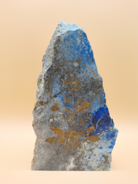 Buddha Silhouette , in afghanischen Lapislazuli gearbeitet und vergoldet. In Anlehnung des durch Taliban zerstörten riesige Buddhastatuen in Bamyan/Afghanistan bei dem nur noch die äußere Silhouette der einstigen 1500 Jahre alten Kunstwerke erhalten blieben. Schweizer Handarbeit. Unikat