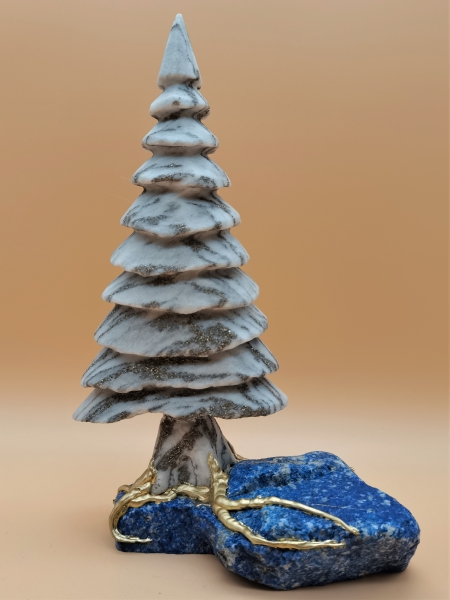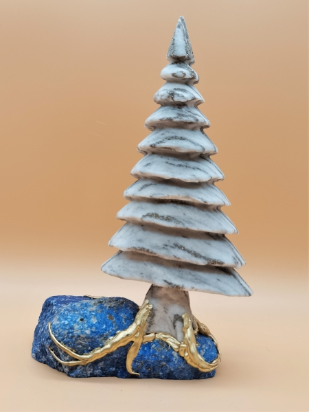 Goldmarmor-Baum mit M-vergoldeten Wurzeln auf getrommelten Lapislazuli. Die Natur ist im Meer und im Gebirge der größte Baumeister an die sich Lebewesen anpassen müssen. Ein Baum der als Samen einst in einer Felsspalte aufging und sich im Laufe seines Lebens an Standort angepasste, hat mit uns Menschen auch dieses gemein. Schweizer Handarbeit, Einzelstück, signiert und Nummeriert von P. Fraefel. Unikat