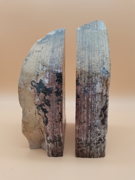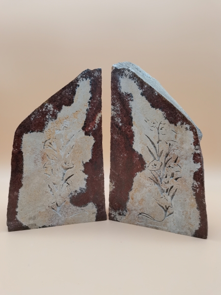 Eigenfund von einem der schönsten Dörfer der Provence. Bearbeitet in unserer Werkstatt im Allgäu. Aufgeschnitten und geschliffen, Gräser und Blüten zieren die beiden Flächen der Eisen- und Ockerschichten. Einzelstücke bewahren Geschichte, Masse verdrängt diese. Idee und Herstellung, Steinbildhauer P. Fraefel. Unikat