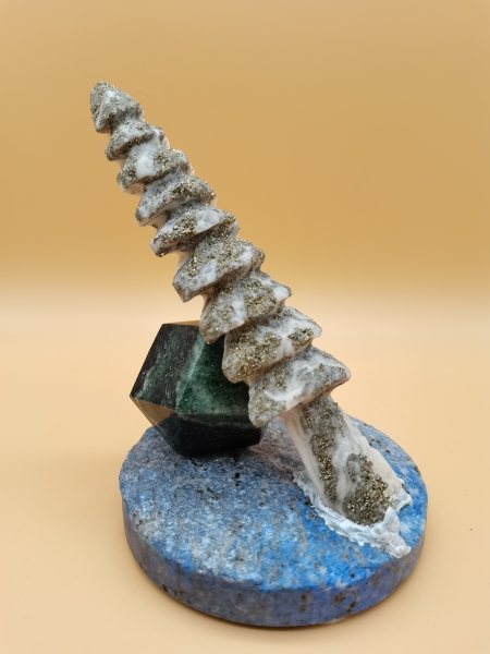 Du gehst im Frühling durch einen Lichtdurchfluteten Wald und entdeckst einen Baum den die Schneelast auf die Seite gedrückt hat. Ein Moosbewachsener Fels hat ihm das Leben gerettet und somit wird er weiter wachsen, den Strahlen der Sonne entgegen. Oft sind es Steine die Leben erst möglich machen. Diese Skulptur ist ein Symbol des Wiederstand, kein Aufgeben in jener prekären Lage in dem man sich befindet. Walliser Goldmarmor, Finnischer Fuchsit-Quarzit, Lapislazuli. Steinmetzmeister P.Fraefel. Unikat