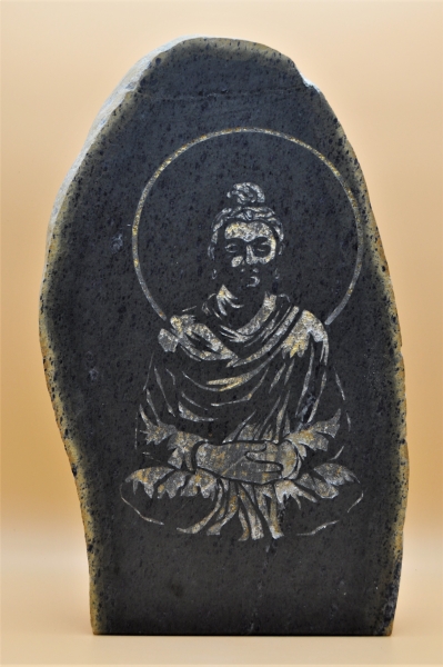 Handgearbeiteter Buddha in Gletscher Serpentin aus dem Walliser Binntal. Durch die äußere Verwitterung des Findlings erscheint dem Betrachter eine Aura um Buddha, die sich nach geschichtlicher Überlieferung in einer Höhle befand. Buddha in fein geschliffener Oberfläche eingearbeitet und antik vergoldet. Rückseite Natur. Schweizer Handarbeit. Unikat