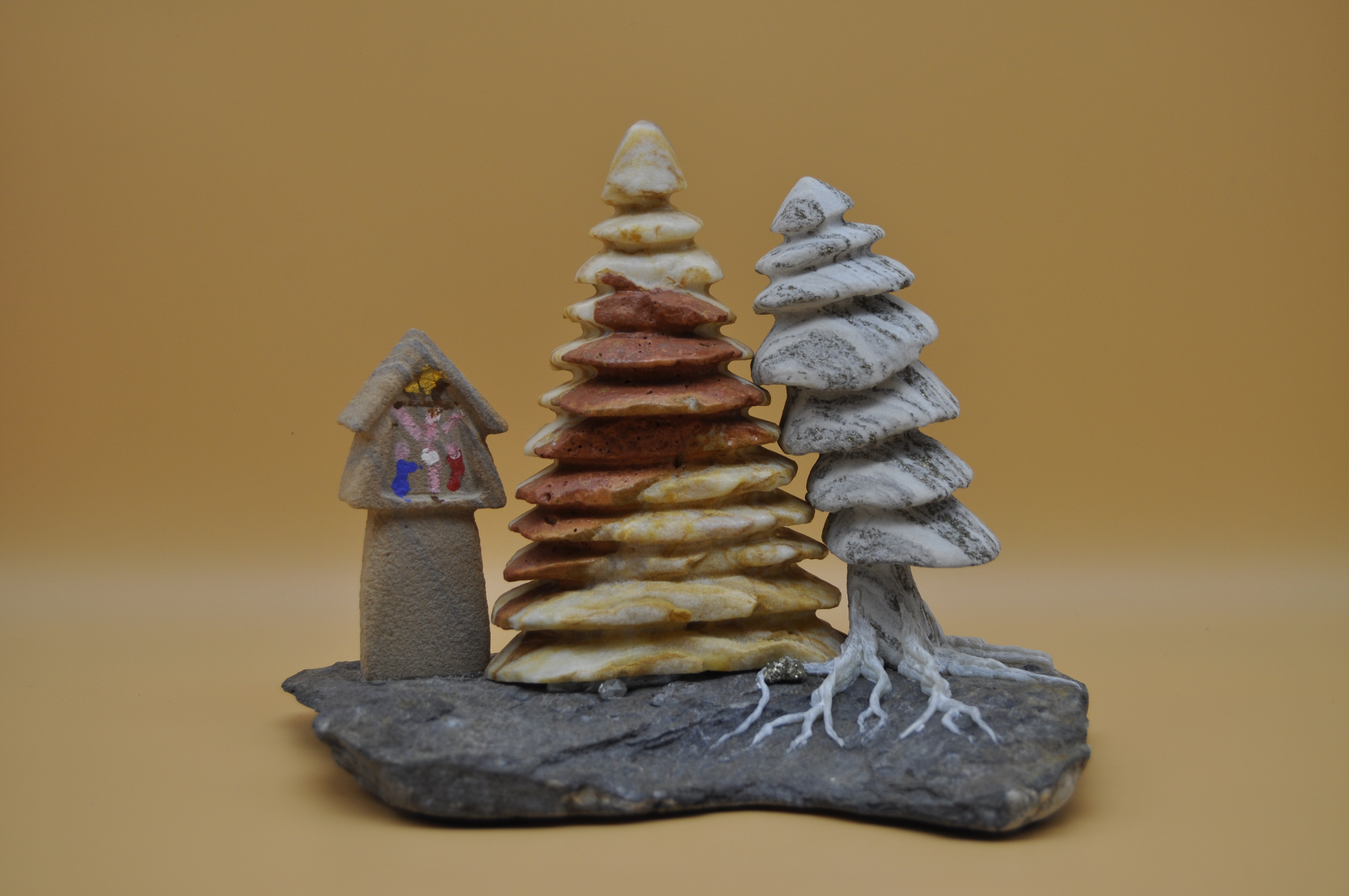 Bildstock aus Rainbow-Sandstein ( akad. Maler und Bildhauer Franz Höchstötter ), einer Kalksinter-Tanne und einem Goldmarmor-Binntree mit colorierten Wurzeln auf Bündnerschiefer aus dem Binntal im Wallis, dort wo sich der Afrikanische Kontinent über den Eurasischen Kontinent schiebt. Allgäuer Handarbeit, Nummeriert und signiert. Unikat